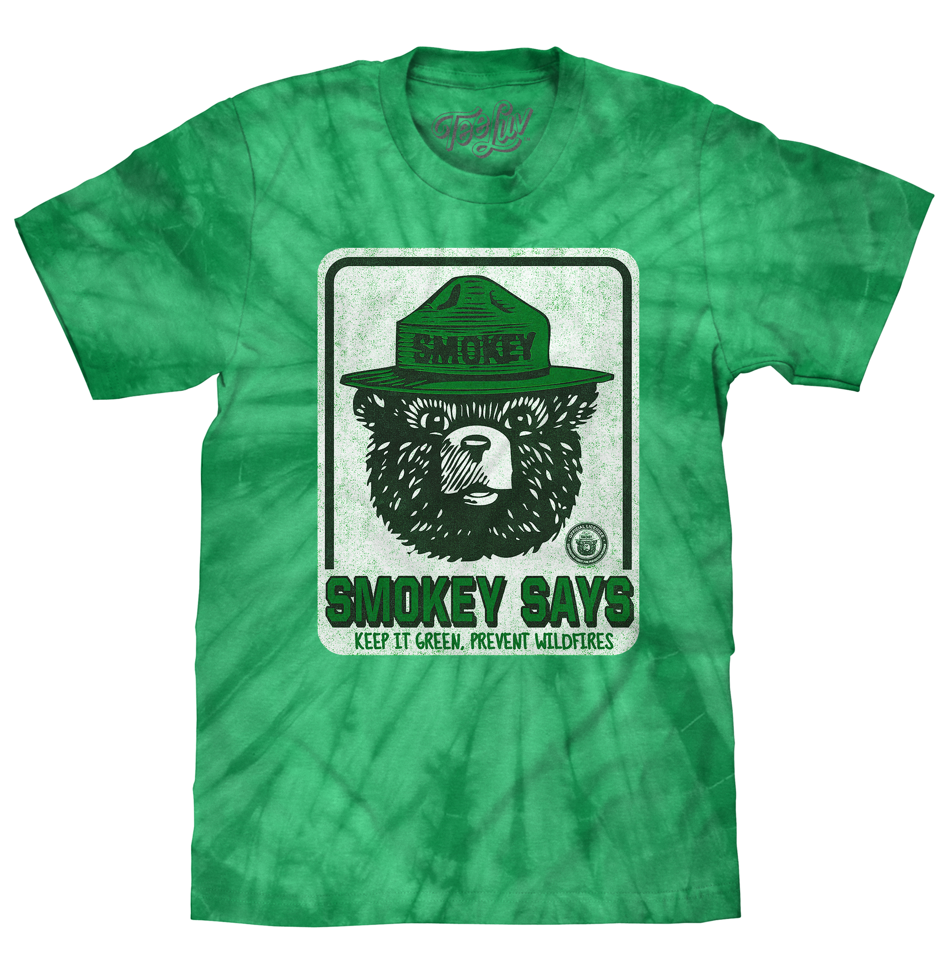It's not easy keeping the nation's beautiful forests and parks safe from the threat of dangerous wildfires, but the United States Forest Service has the right bear for the job! Smokey Bear has been teaching us how to be safe and responsible on every outdoor adventure, and to help him on his quest - we've crafted this delightfully retro tie-dye t-shirt featuring the iconic mascot wearing this signature campaign hat, along with the "Smokey Says Keep It Green, Prevent Wildfires".