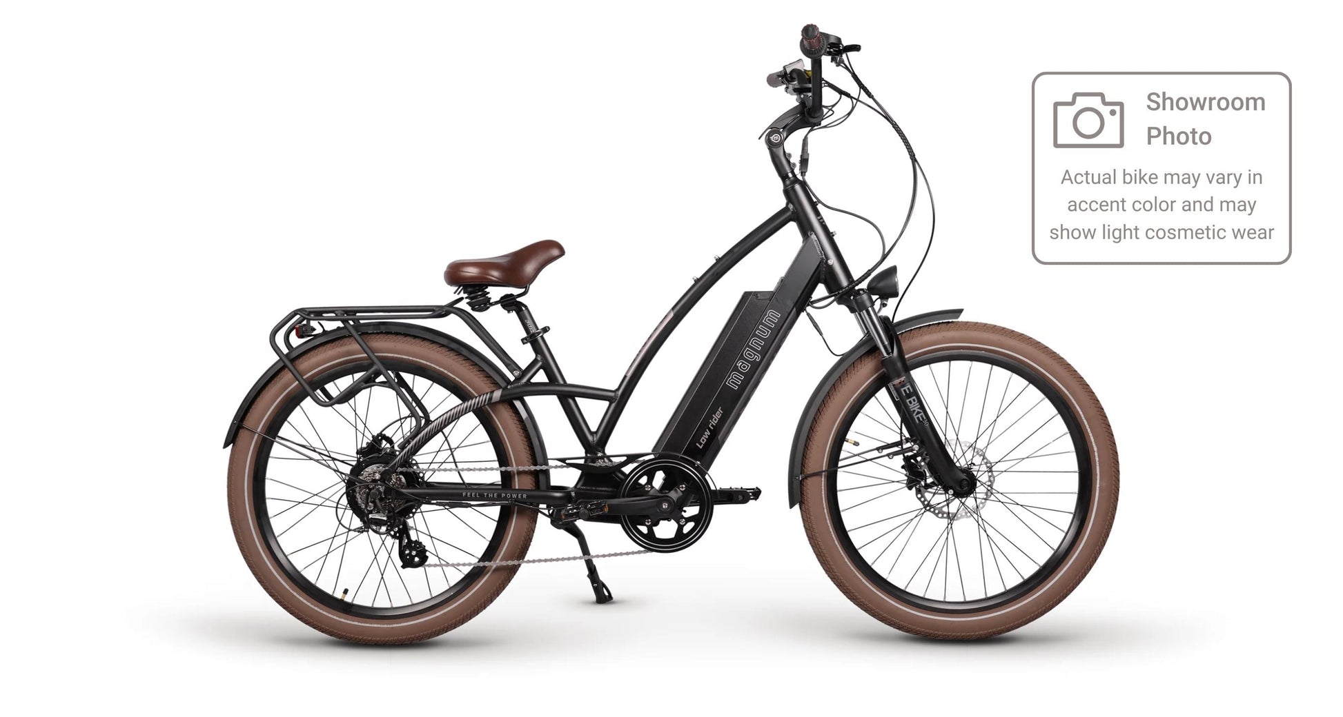 Cruise with comfort and style! The Magnum Low rider is an easy-to-mount low-step beach cruiser style electric bike well suited for urban cycling.