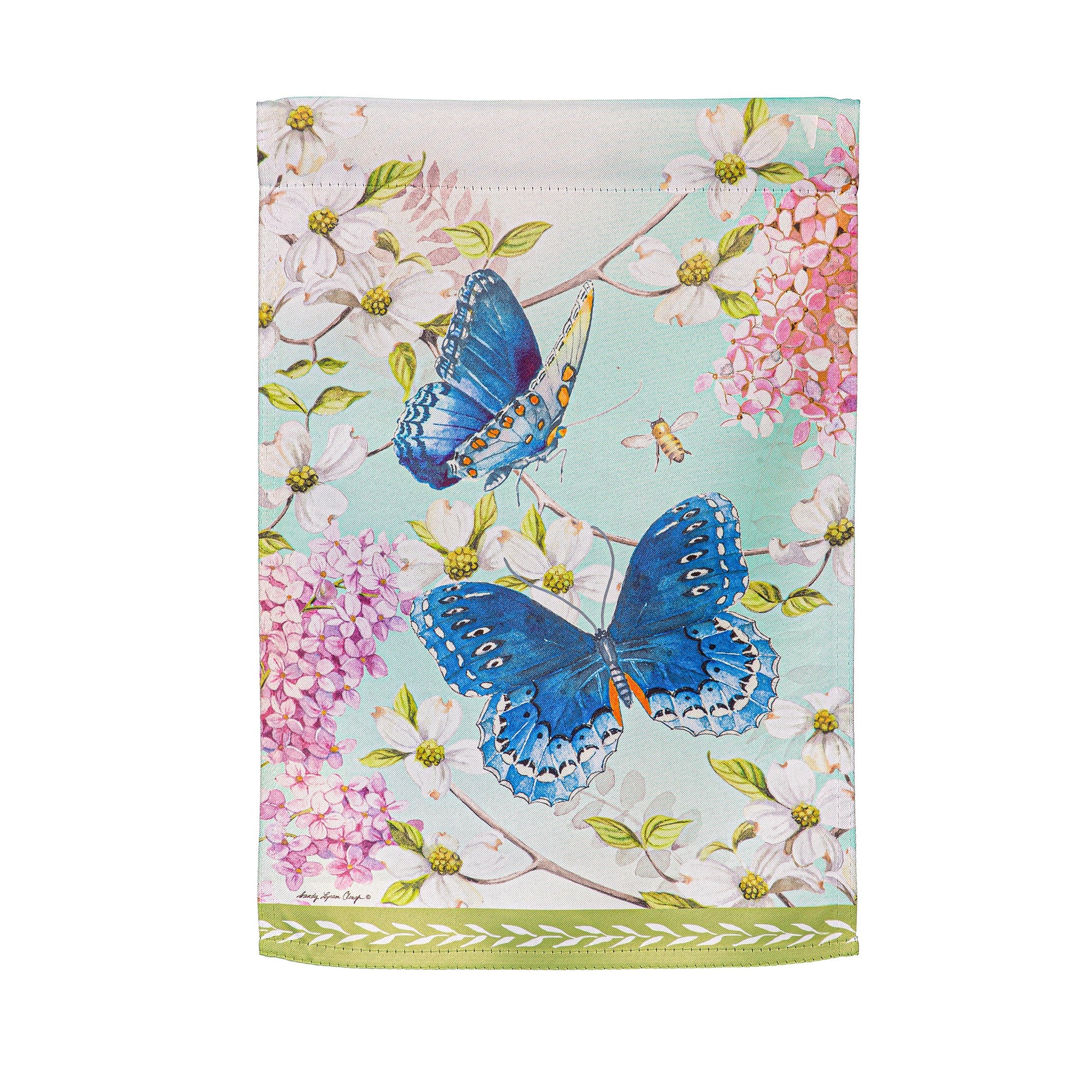 This charming flag adds an extra special touch to any home. Features lively colors and attractive My Garden design. Flag is crafted of medium-weight suede fabric made from recycled plastic that provides a soft and durable texture. Artwork is heat transferred onto the sun-blocking material so that it is easily viewed from both sides. The weatherproof flag will not fray or fade with continued outdoor use. This flag features a sleeve for use with any standard flagpole or stand, sold separately.