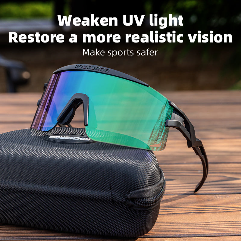 Photochromic Lenses: The bike glasses lenses change as the outdoor light changes. The color of photochromic bike glasses will change from clear to grey in sunny days, effectively protecting your eyes and maintaining a comfortable light feeling.