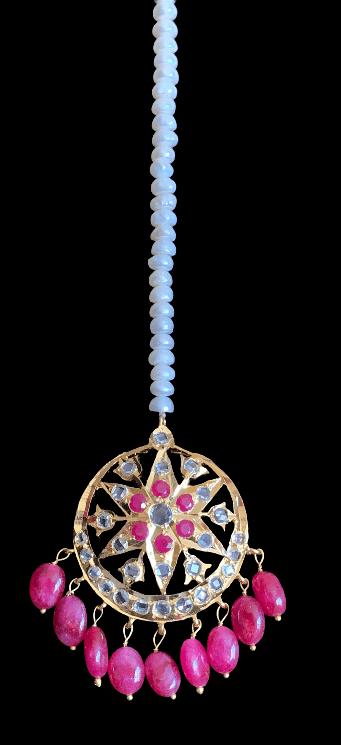 made using fresh water pearls with ruby ( Chatham) stones and beads