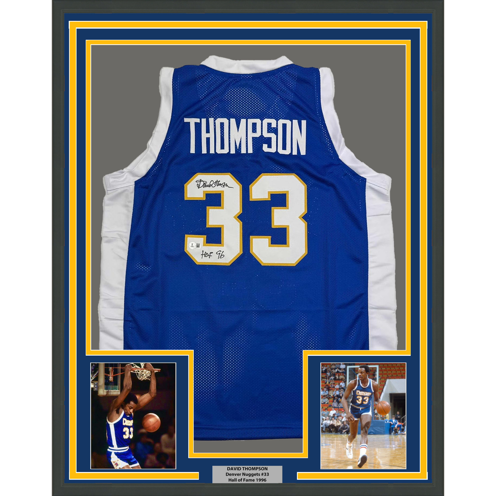 Framed Autographed/Signed David Thompson 35x39 HOF 96 Denver Blue Retro Rainbow Basketball Jersey Beckett BAS COA