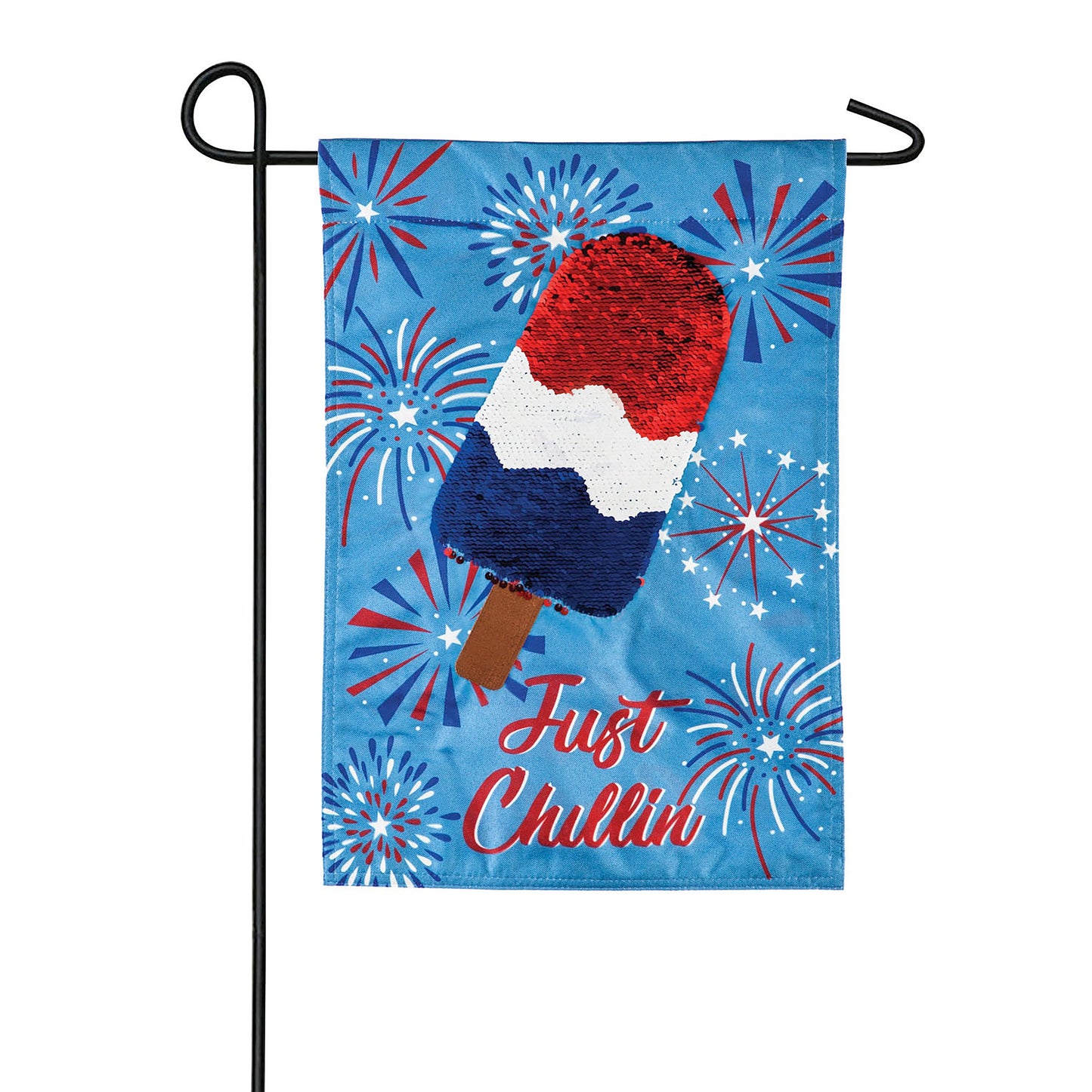 Let your patriotism shine bright with this Just Chillin' Popsicle Garden Linen Flag. The reversible sequined design changes from red to blue for a fun switch. Show off your American pride during the summer months and beyond with this enjoyable flag! Made of lightweight, durable linen material, this lively flag is designed to withstand a variety of weather conditions. Our flag creation process involves combining pieces of fade-resistant fabric with tight, detailed stitching in order to create a dimensional effect. Printed ink colors are protected with a watertight seal, so you can enjoy your flag for years to come.