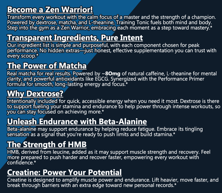 If you had to pick one supplement for all-around fitness performance, this is it. Introducing Training Tonic’s Performance Primer – your complete, all-in-one pre-workout, creatine, and post-workout support formula.