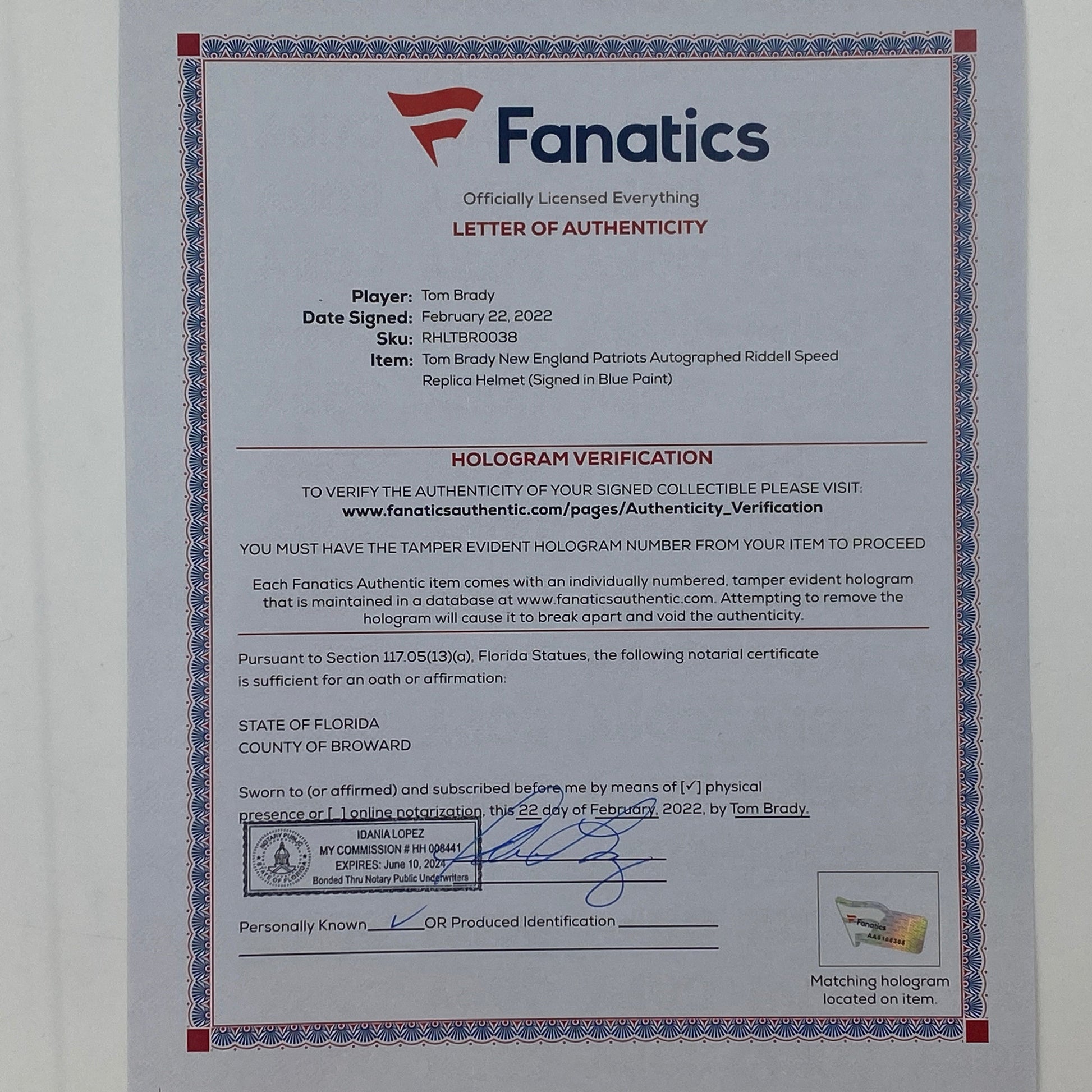Autographed/Signed Tom Brady New England Patriots Full Size FS F/S Speed Replica Football Helmet Fanatics COA/LOA