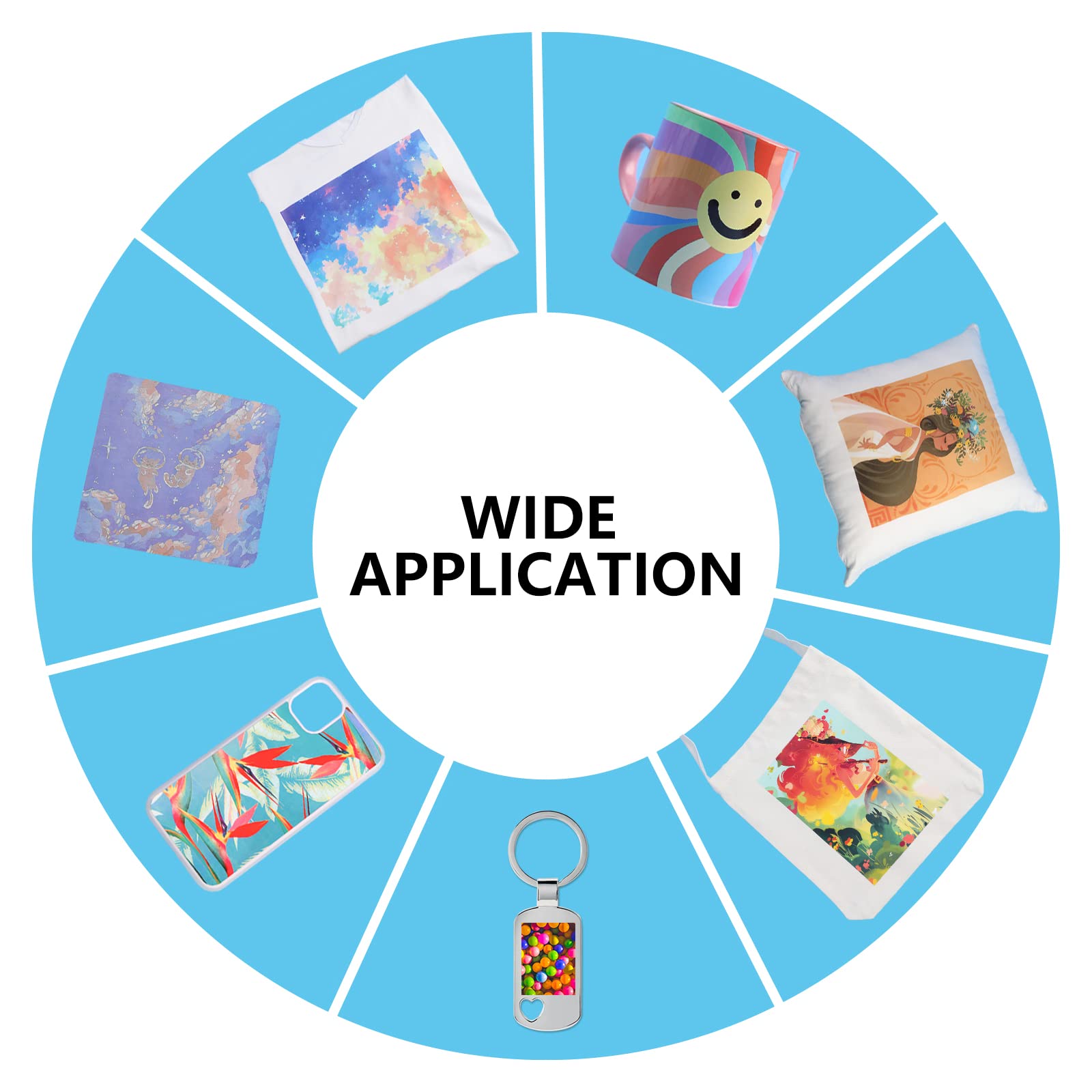 This high-quality sublimation paper is designed for use with light-colored polyester fabrics and polyester-coated items. It's suitable for creating custom designs on various products, including: