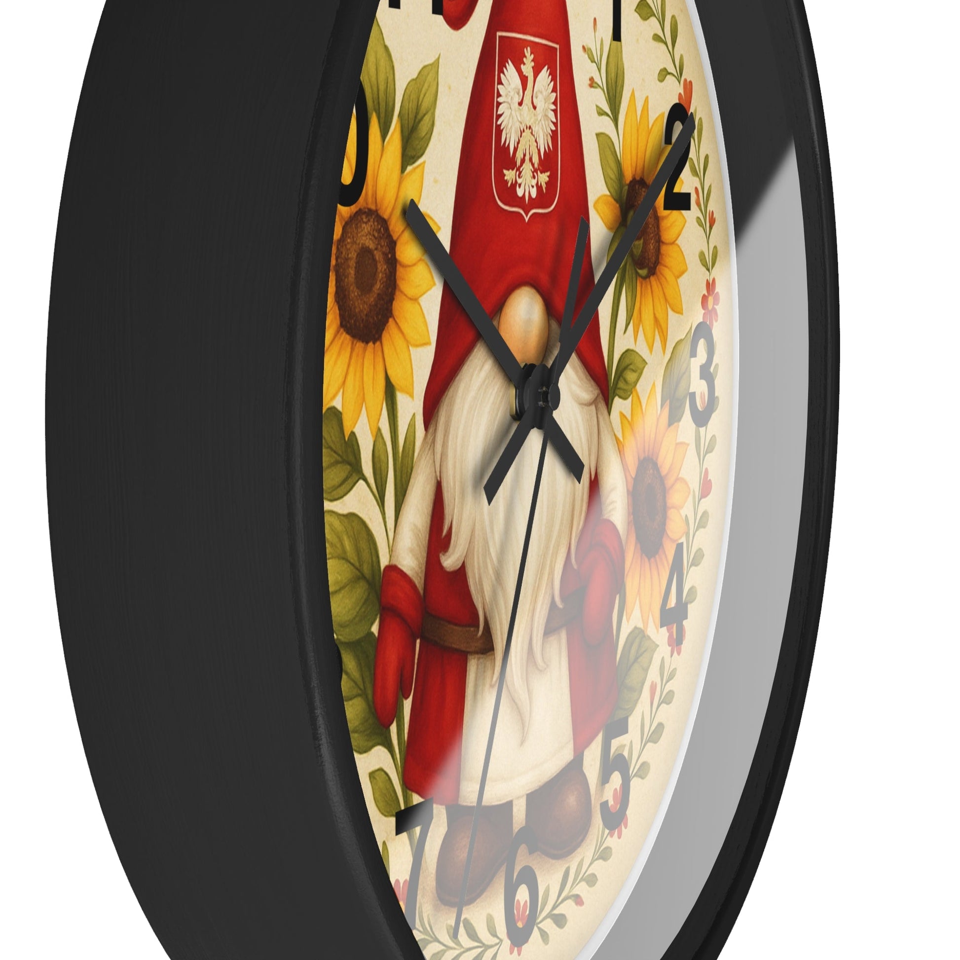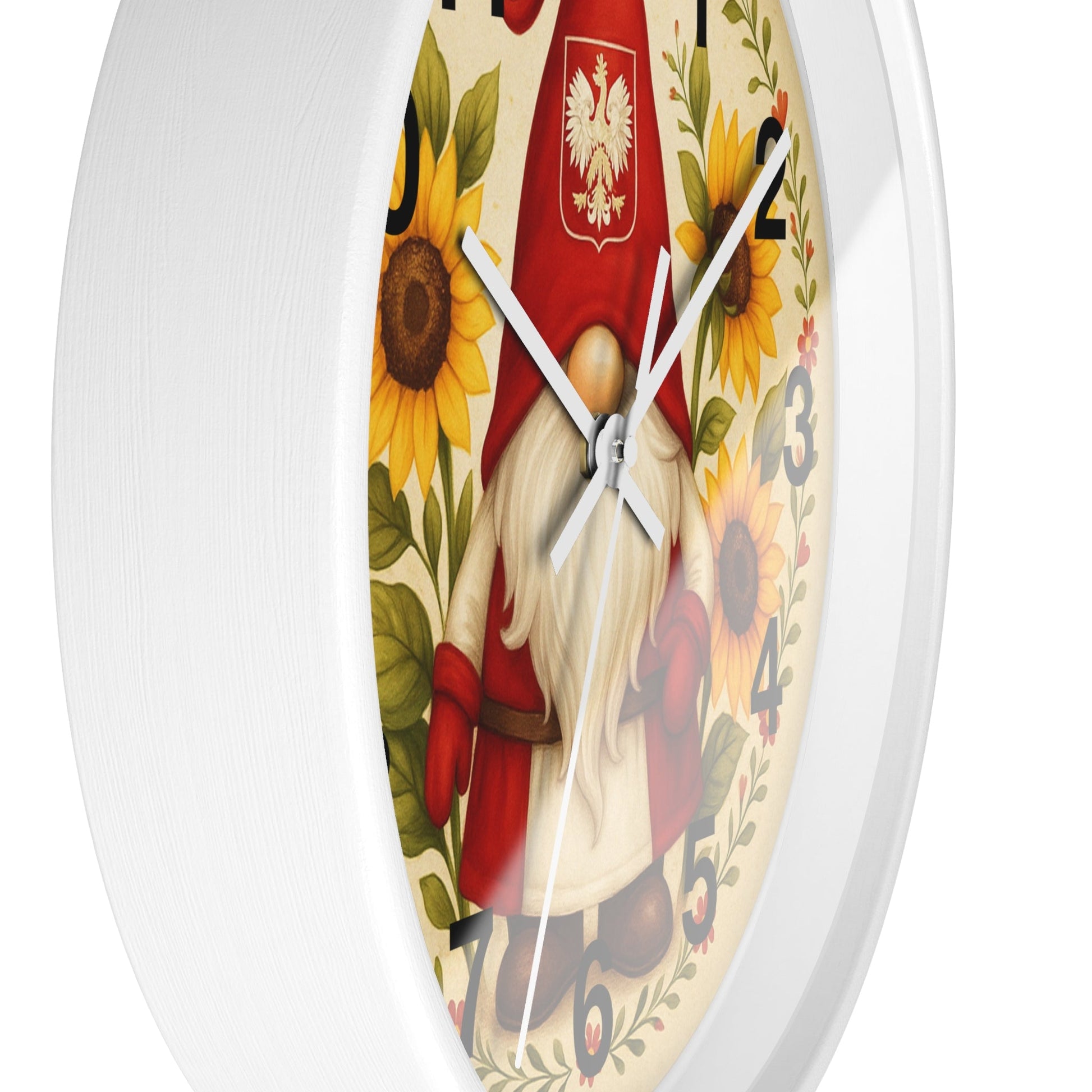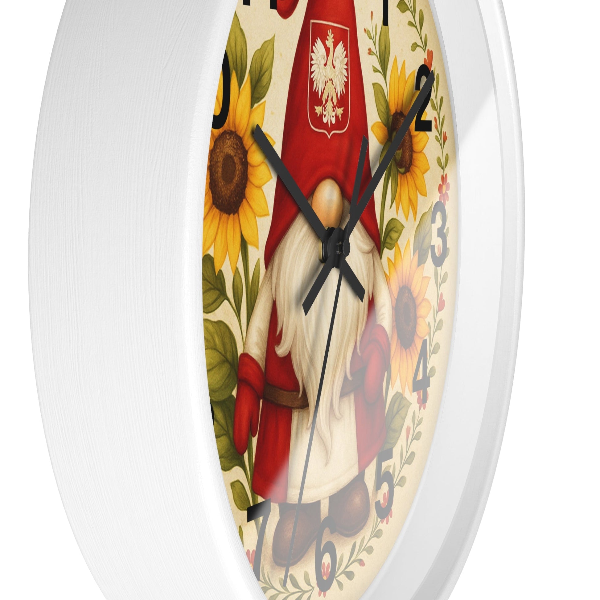 Bring a little Polish sunshine into your home with this Polish Sunflower Gnome Wall Clock! Featuring a cute gnome in traditional Polish colors surrounded by bright sunflowers and Slavic folk art patterns, this unique floral gnome design adds heritage charm to any room. Every second counts! An exciting and practical accent, this high-quality wall clock makes the perfect statement piece for Polish kitchen decor, babcia’s cozy nook, or as a thoughtful Polish pride gift. Whether you're decorating for the seasons or searching for a sunflower gnome gift, this clock is full of personality. Perfect for Polish babcia gifts, Slavic decor, or anyone who loves cute floral gnomes and folk art decorations.