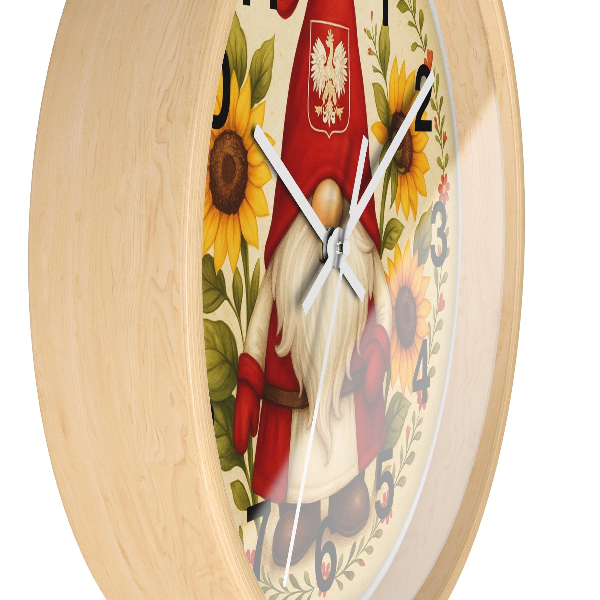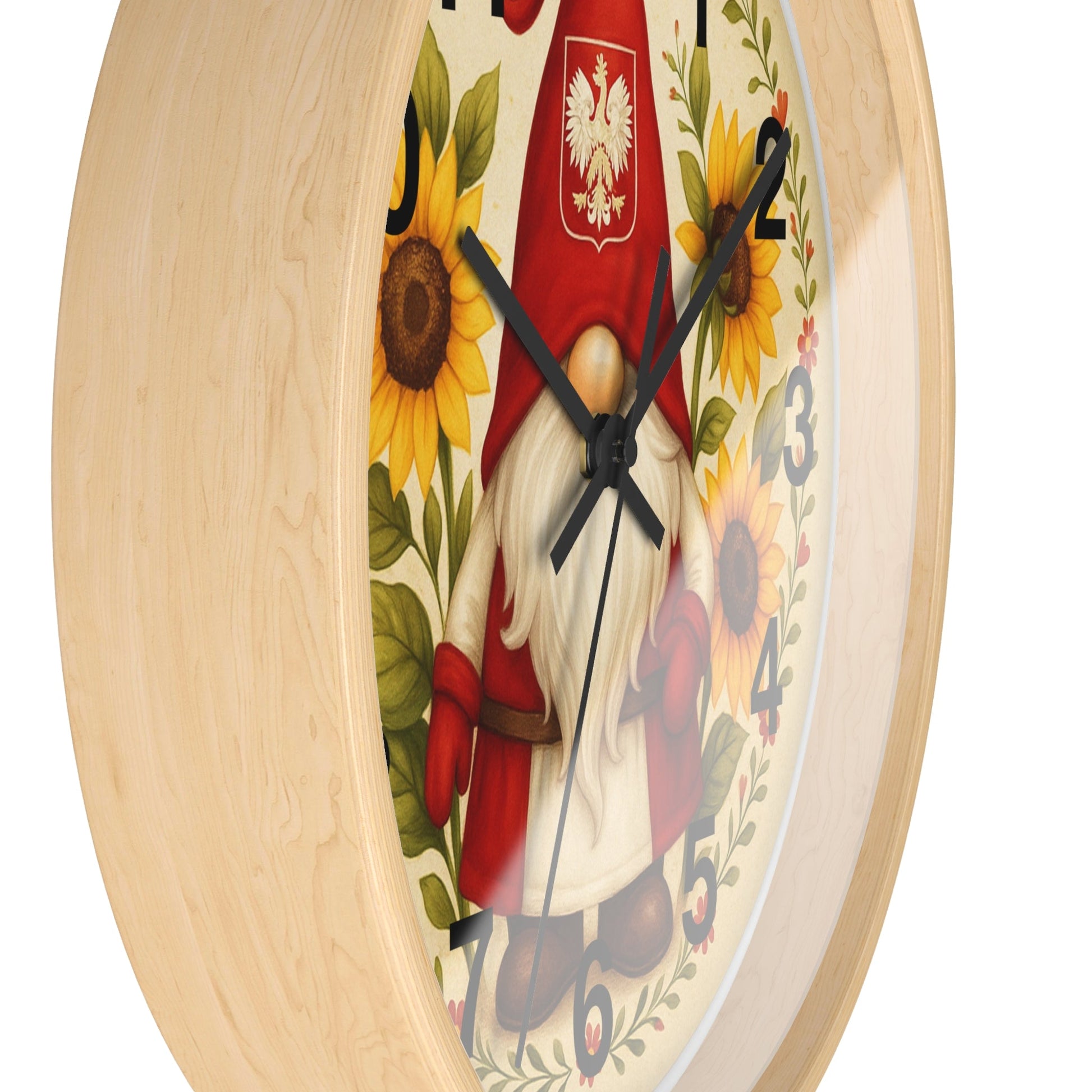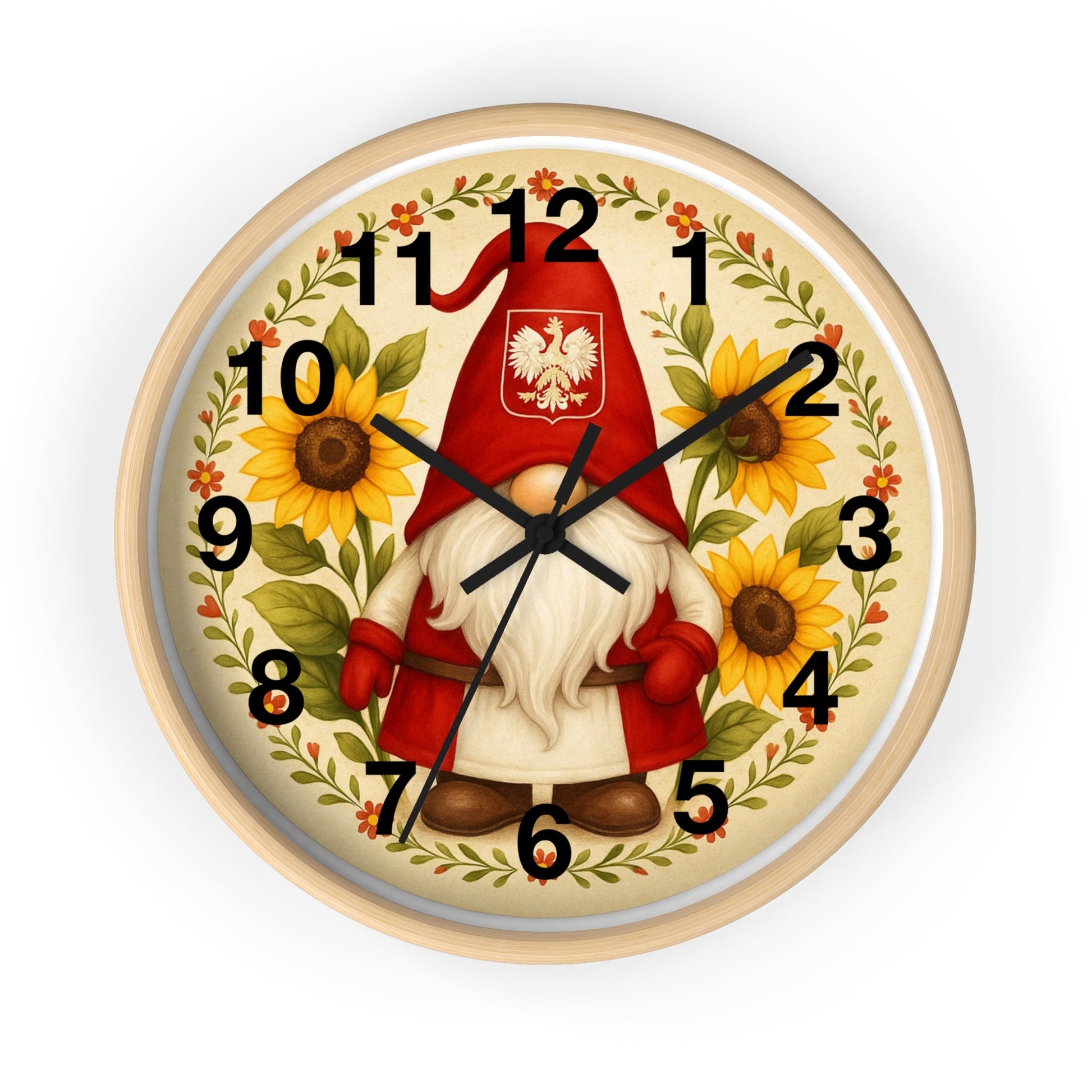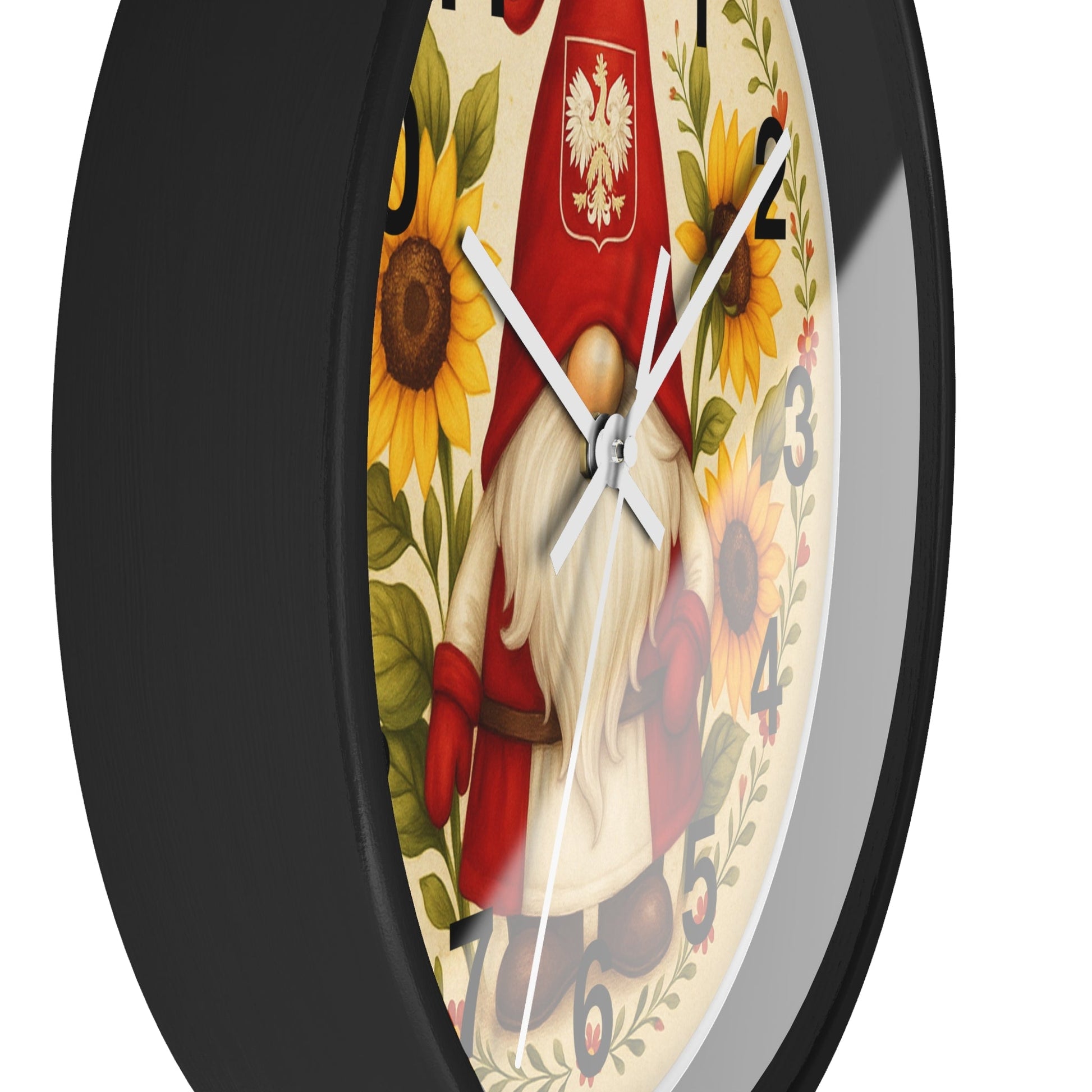 Bring a little Polish sunshine into your home with this Polish Sunflower Gnome Wall Clock! Featuring a cute gnome in traditional Polish colors surrounded by bright sunflowers and Slavic folk art patterns, this unique floral gnome design adds heritage charm to any room. Every second counts! An exciting and practical accent, this high-quality wall clock makes the perfect statement piece for Polish kitchen decor, babcia’s cozy nook, or as a thoughtful Polish pride gift. Whether you're decorating for the seasons or searching for a sunflower gnome gift, this clock is full of personality. Perfect for Polish babcia gifts, Slavic decor, or anyone who loves cute floral gnomes and folk art decorations.