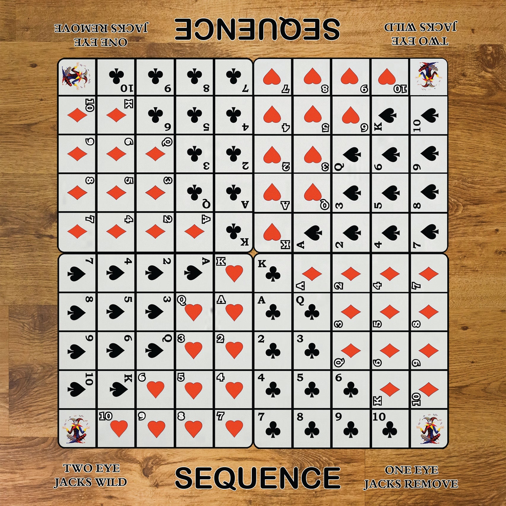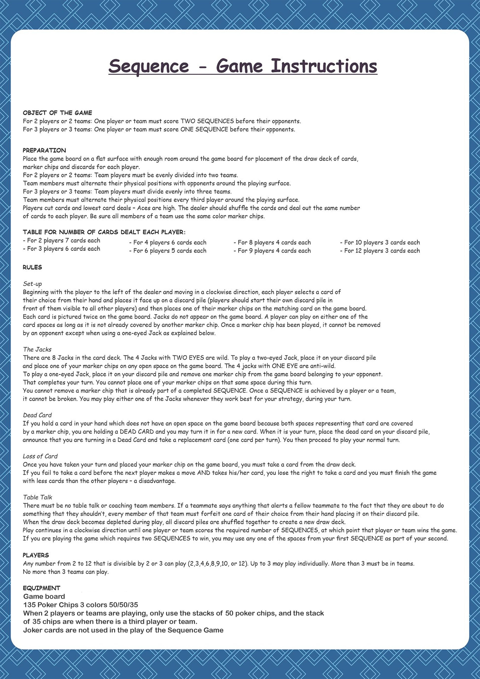TABLE TALK: There must be no table talk or coaching team members. If a teammate says anything that alerts a fellow teammate to the fact that they are about to do something that they shouldn’t, every member of that team must forfeit one card of their choice from their hand placing it on their discard pile. When the draw deck becomes depleted during play, all discard piles are shuffled together to create a new draw deck. Play continues in a clockwise direction until one player or team scores the required number of SEQUENCES, at which point that player or team wins the game. If you are playing the game which requires two SEQUENCES to win, you may use any one of the chips from your first SEQUENCE as part of your second.