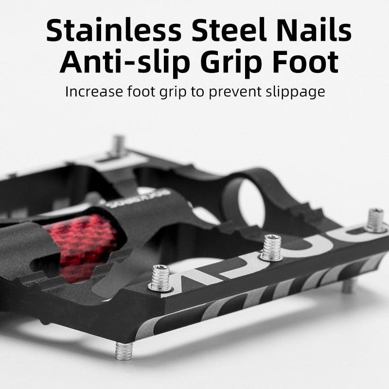 - GREAT GRIPS: THIS mountain bike pedals provide more security on the pedals and effectively prevent your shoes from sliding off, each side of the pedal with 9 stainless steel pins, provide strong grips and we gift extra 3 nails to replace, make the cycling safer, better for riding or racing.