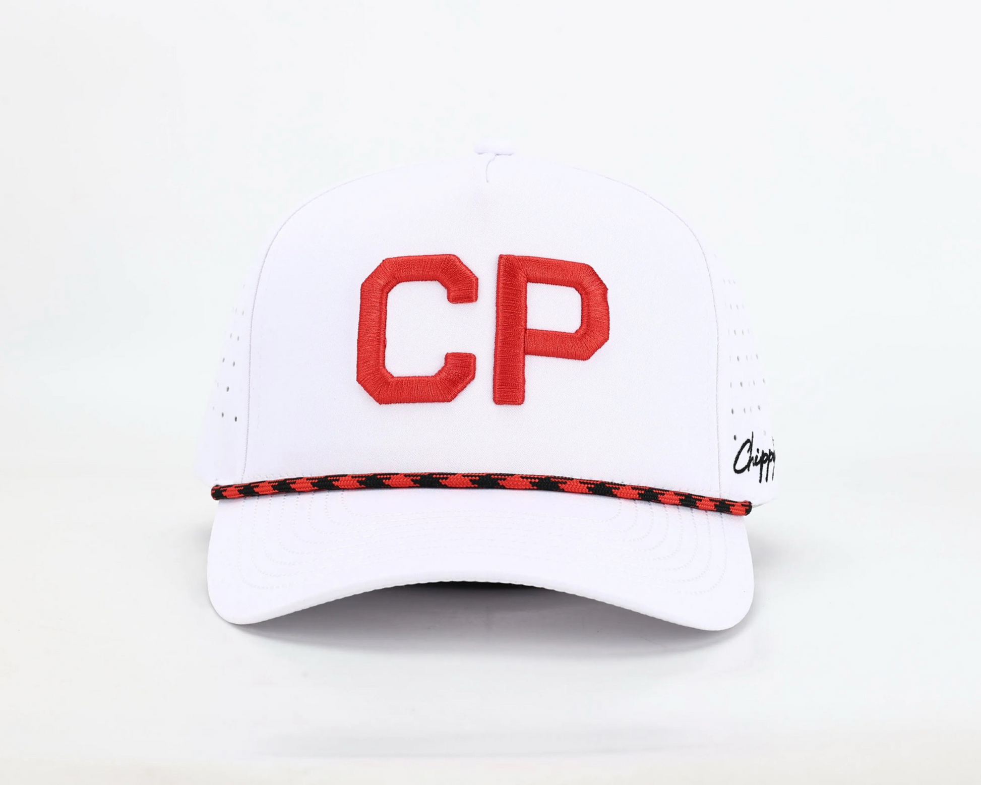 Waterproof material, sweatproof band. 5 panel classic laser cut drilled hole hat in color white with red rope. CP 3D embroidery on the front and Chippopotamus name on the side.