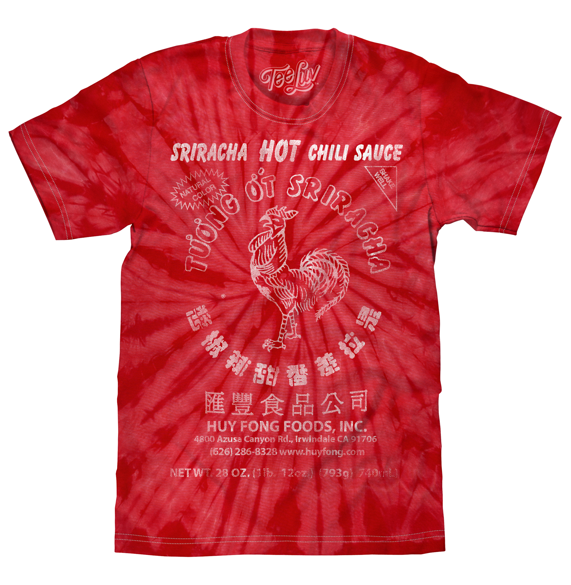 There's a pecking order when it comes to spicy sauces, but don't be fooled by the hype - only Huy Fong's Tuong Ot Sriracha sauce rules the roost! To help our fellow Sriracha-addicts show off their love for this awesome hot sauce, we've crafted this tasty foodie t-shirt featuring the Sriracha Hot Chili Sauce rooster logo. To complete the vintage look and feel of this Sriracha shirt - we've distressed the graphic to look like it's been in your closet pho-ever, and printed it on a soft, red tie dye cotton tee. The perfect base for your next Sriracha costume, or just everyday casual wear!