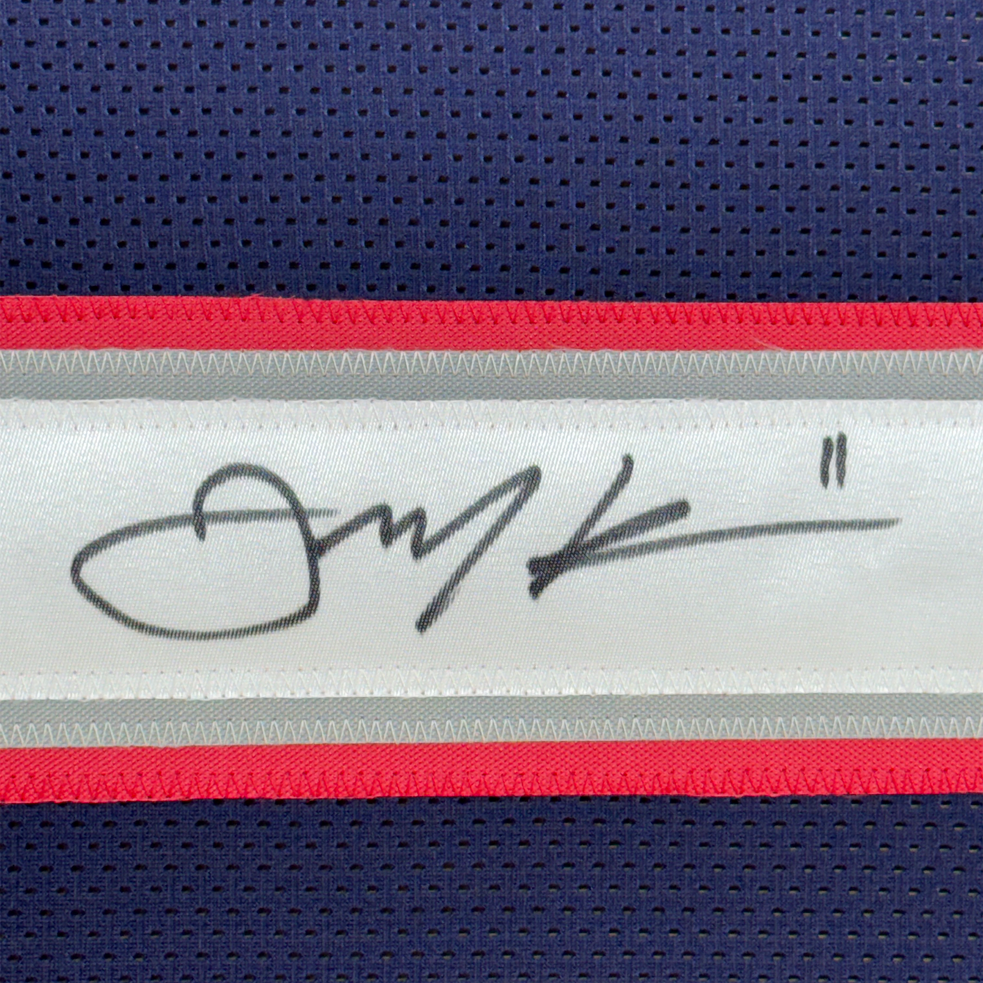 Framed Autographed/Signed Julian Edelman 35x39 New England Blue Football Jersey JSA COA