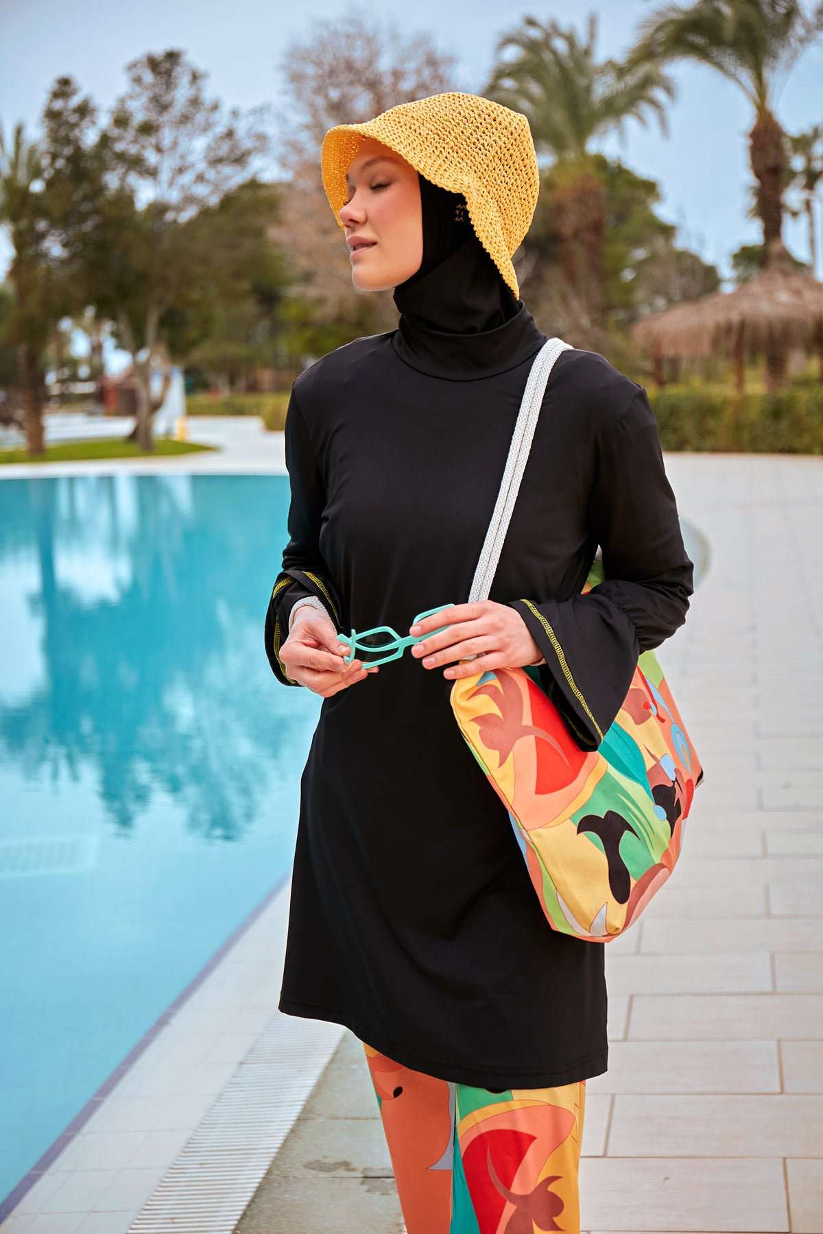 - There are tie strings on the tunic and leggings of the product to prevent your swimsuit from riding up.