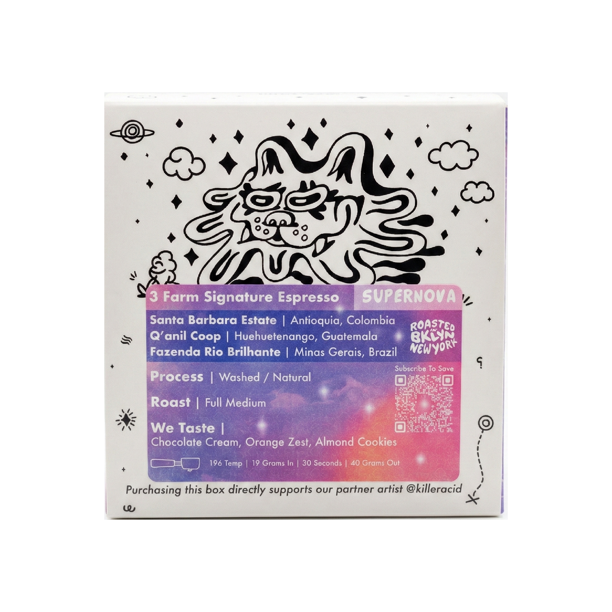 Supernova is our signature espresso and the backbone of many beloved NYC bakeries and cafes. A fusion of three exceptional Latin American farms, it’s crafted to pull consistently excellent shots with beautiful, velvety crema.