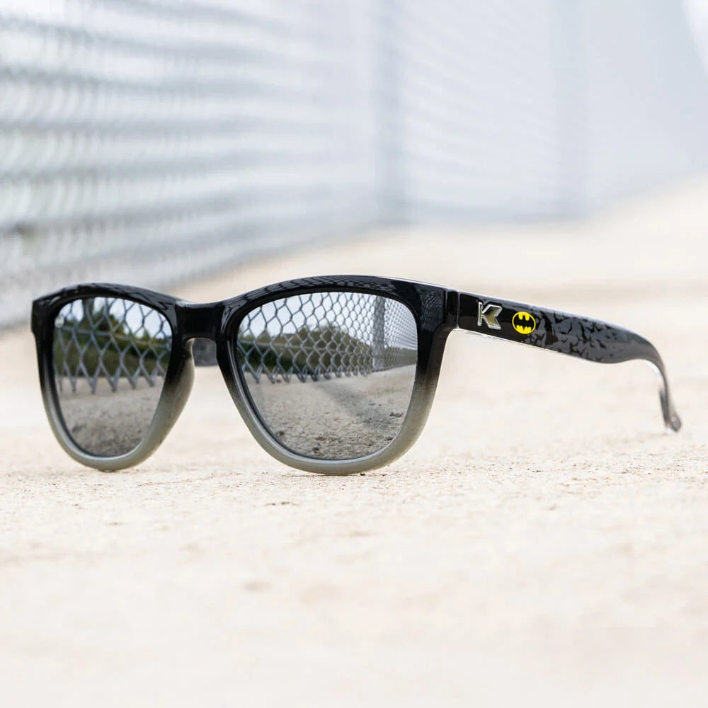 The Batman Kids Premiums are a must-have for any growing comic fan. This pair takes inspiration from the edgy darkness of D.C. Comics’ most popular vigilante, starting with black-to-gray fade fronts. The color scheme continues down each arm, where a swarm of bats fly over a black and gray background. Batman’s iconic yellow crest is prominent on the outside of each arm, while the Batman logo is displayed on the inside of each arm over a black and gray comic strip scene. Polarized Gotham Silver lenses and silver hardware round out this gritty, yet highly wearable pair.