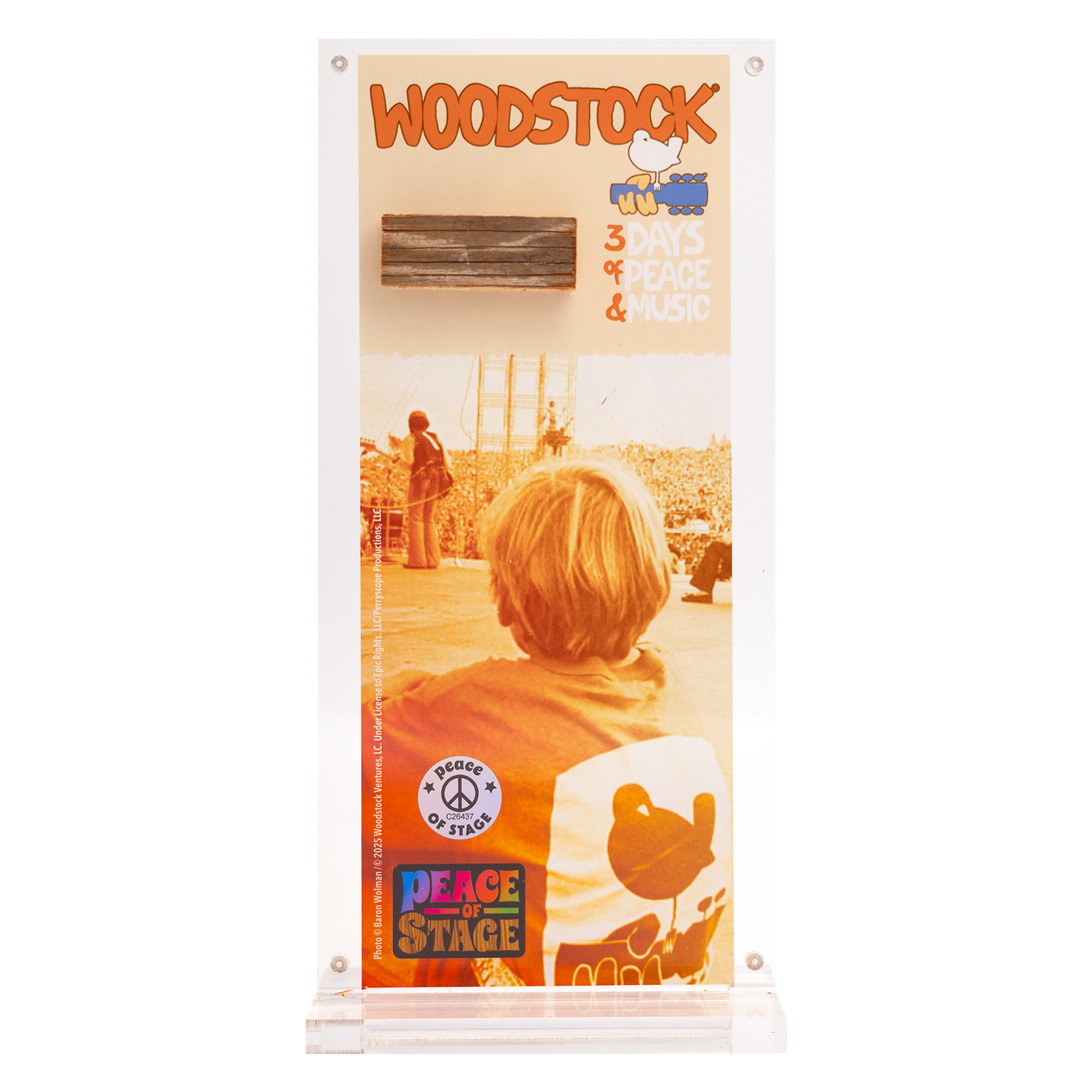 Own a piece of history with this exclusive collector’s acrylic celebrating the iconic Woodstock Music & Art Fair. This stunning design features a legendary image of a young festivalgoer watching history unfold from the Woodstock stage, evoking the spirit of peace, love, and music that defines a generation.