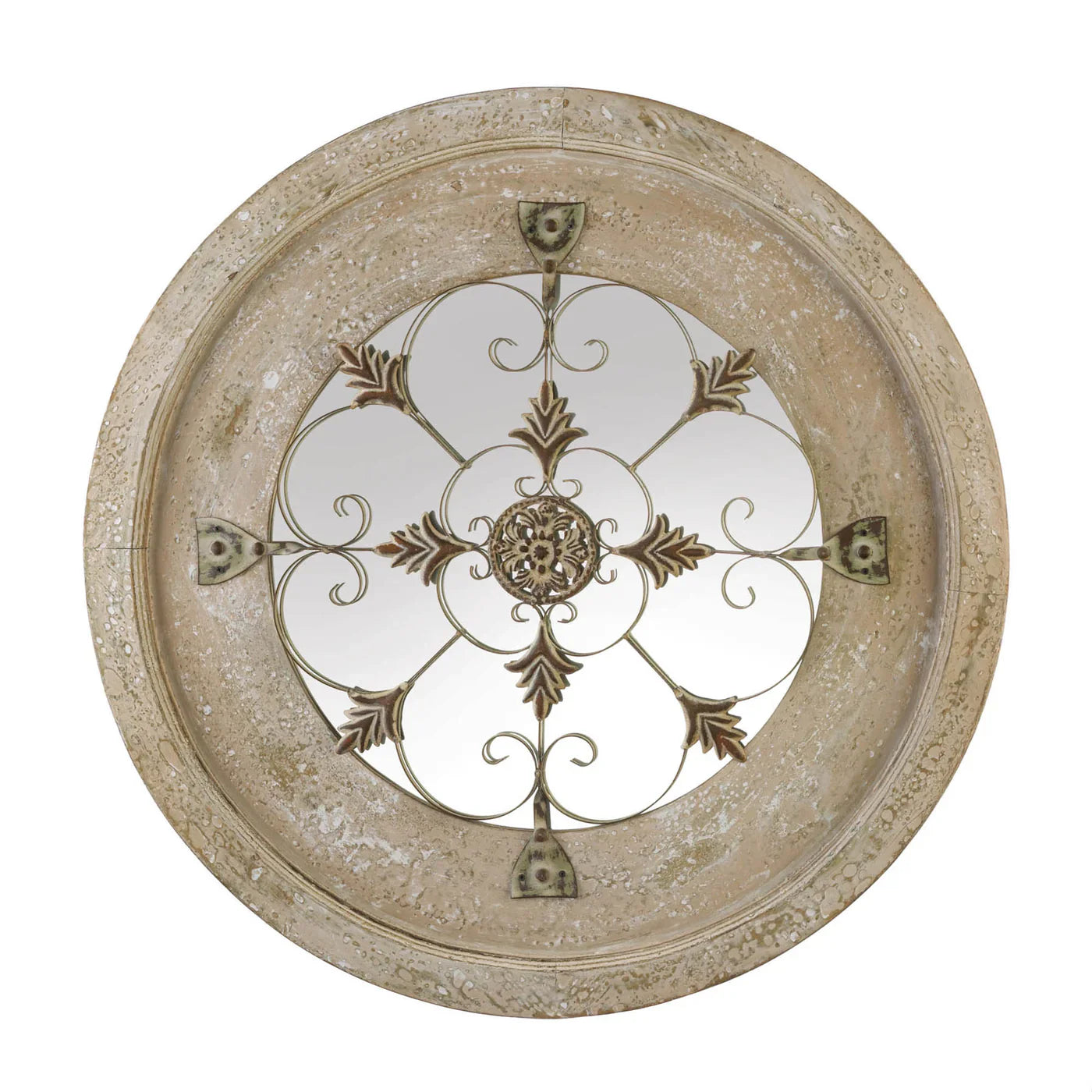 - This one-of-a-kind round wall mirror exudes a country farmhouse feel. Features whitewash wood finish with an overlay of detailed metal embellishments to showcase the mirror beneath. A great housewarming gift or personal home décor piece!