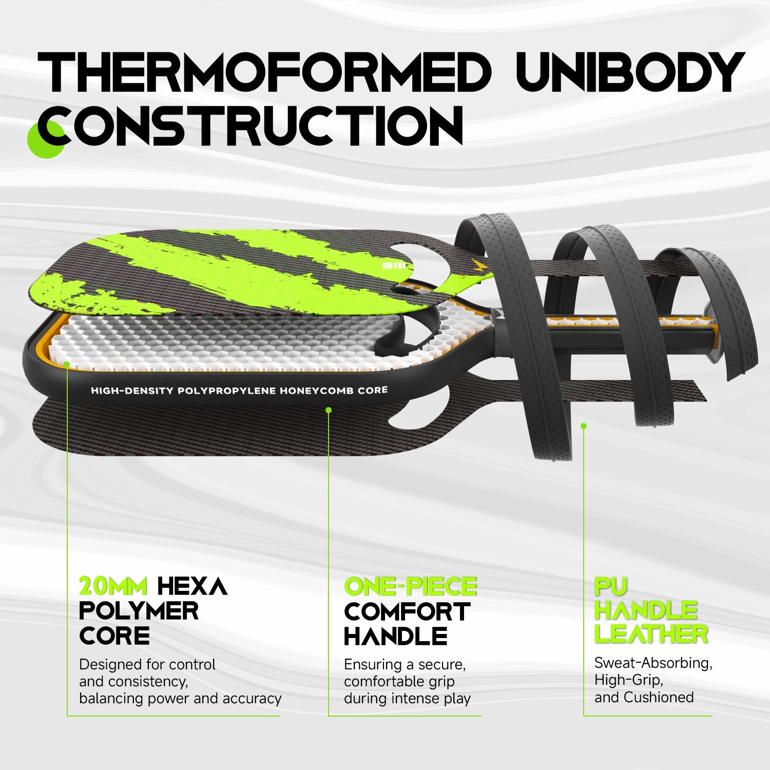 Say goodbye to weak spots and hello to pure consistency. Our thermoformed pickleball paddle features a seamless unibody construction with an edgeless design, eliminating dead zones for flawless performance. Inside, foam-injected walls expand the sweet spot, reduce harsh vibrations, and boost stability, so that every shot feels crisp and controlled. Whether you're ripping drives or finessing dinks, this pickleball paddle for control keeps your game smooth, your wrist happy, and your paddle lasting longer. Built tough, built smart.