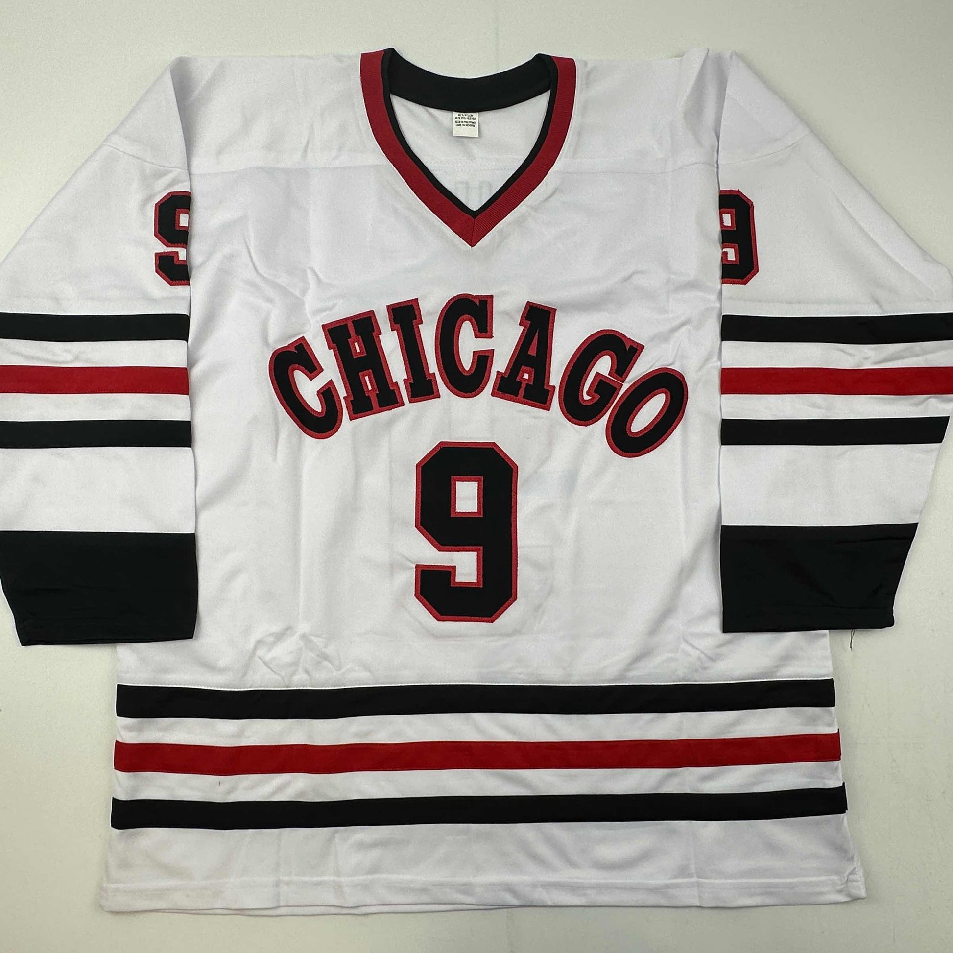 Jersey has no brand names or logos. This is a custom jersey and was not manufactured by or in any manner associated with any professional sports league or manufacturer. This custom jersey carries no professional sports league designation. The item is intended to be an autographed collectible. The custom jersey displays the name and number of the player. This item in no way is affiliated with or connected to any professional sports organization. Size is XL.