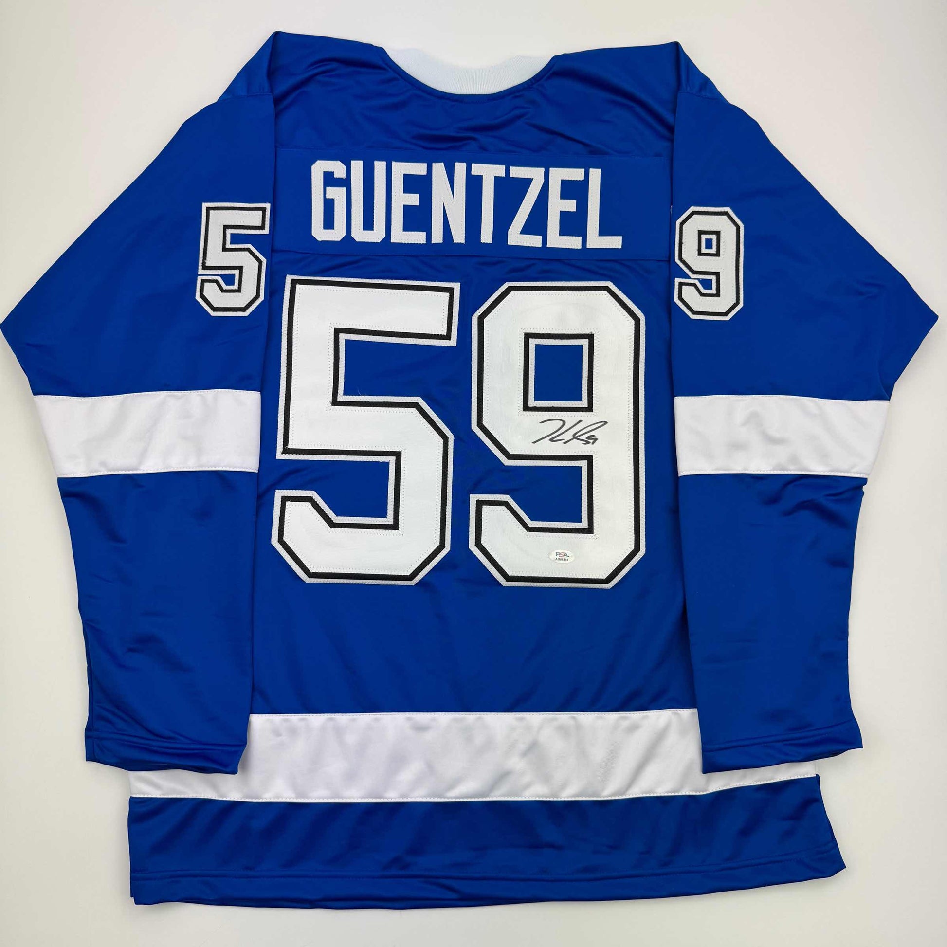 Autographed/Signed Jake Guentzel Tampa Bay Blue Hockey Jersey PSA COA