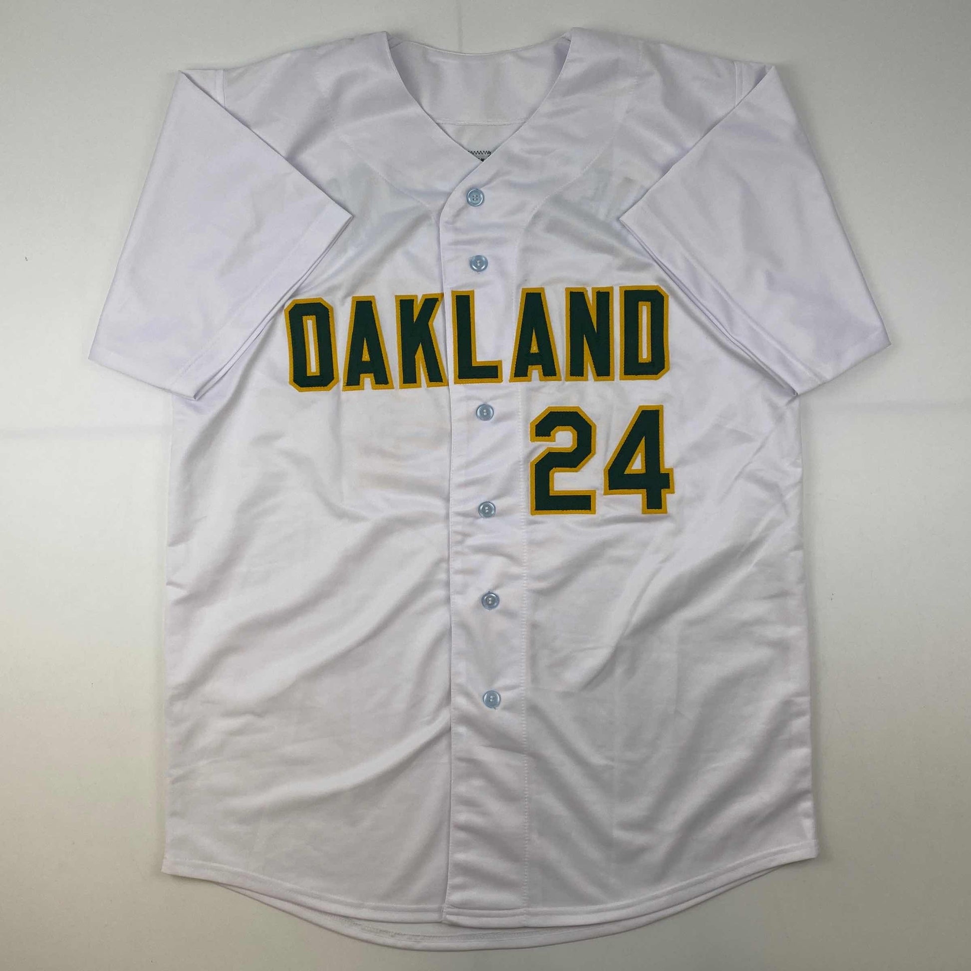 Autographed/Signed Rickey Henderson Oakland White Baseball Jersey Beckett BAS COA