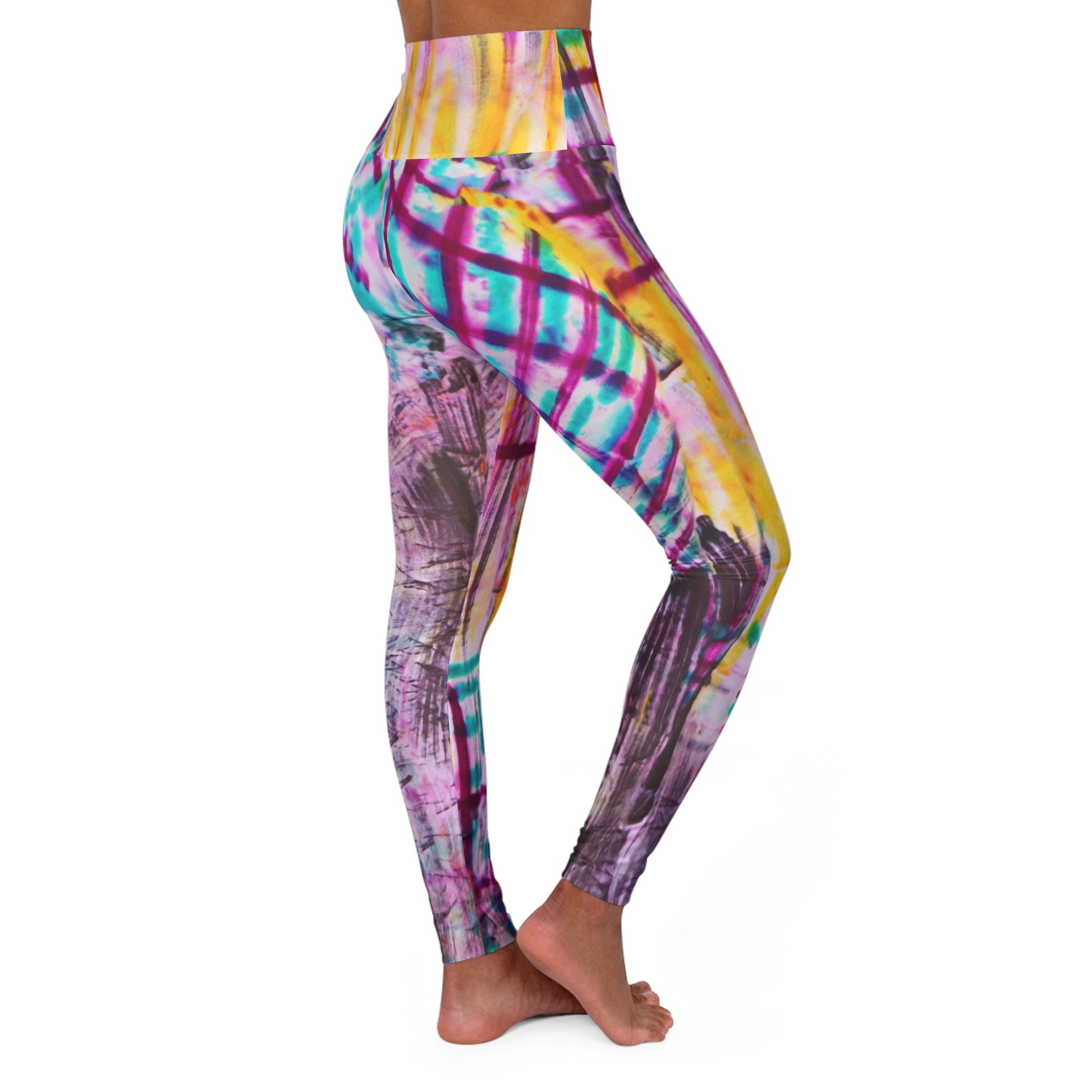 These high-waisted yoga leggings have a skinny fit and can be worn from workout to store in style and comfort. The hand-dyed print adds a pop of color to any athleisure wardrobe.