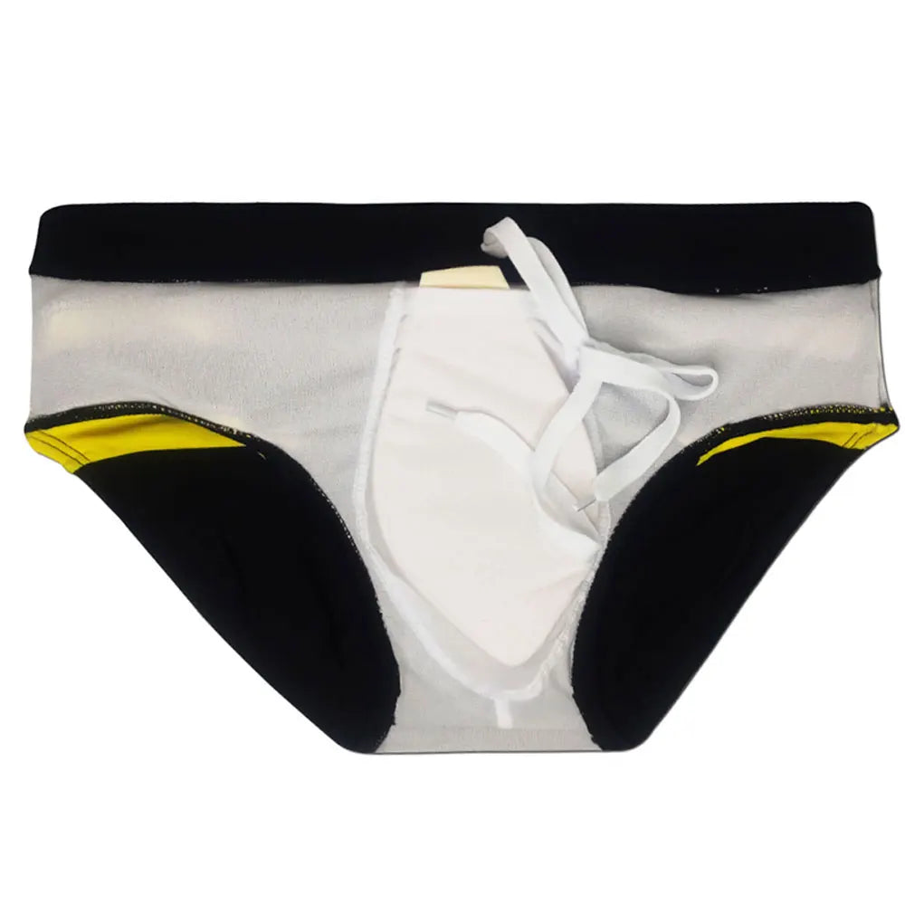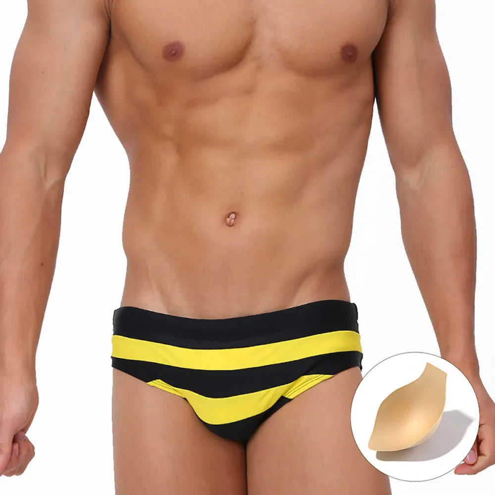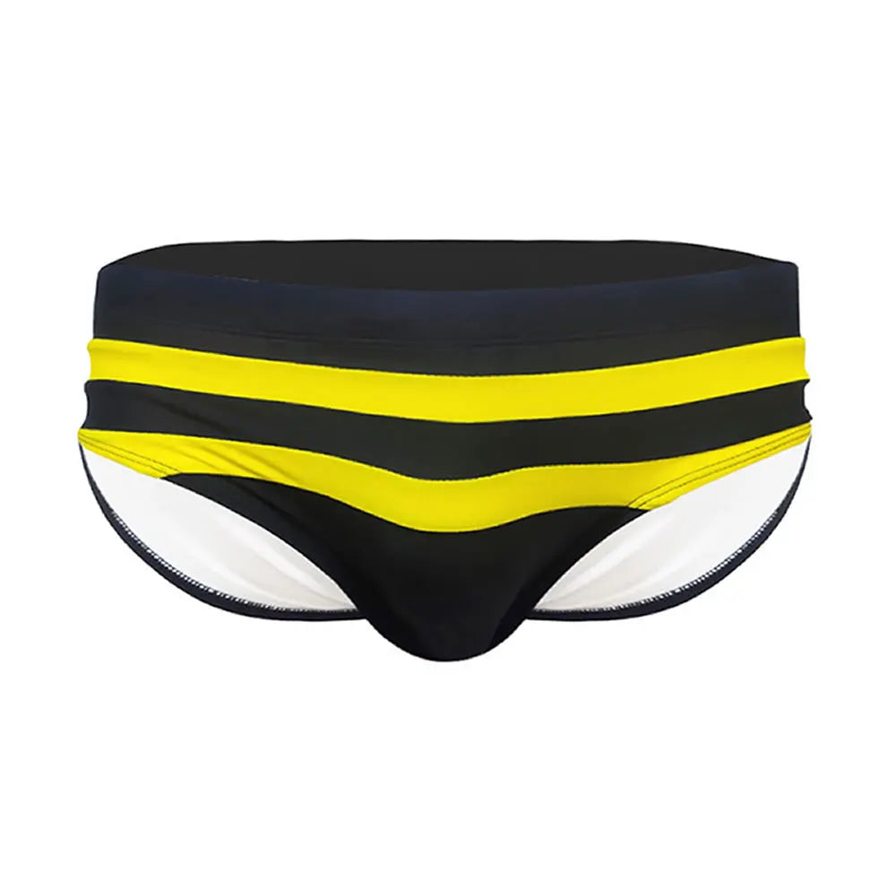 The Bee Stripes Swim Brief offers a daring and adventurous look for men who aren't afraid to take risks! Made with a blend of durable polyester and stretchy spandex, these briefs are perfect for swimming or any other high-motion water sports. Designed with bold stripes and featuring a smaller-than-usual fit, these briefs will surely make a statement at the beach or pool. So go ahead and add a touch of excitement to your swimwear collection with the Bee Stripes Swim Brief!