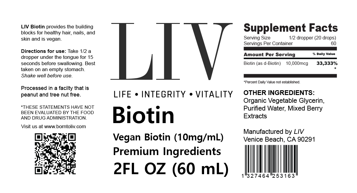 LIV Biotin is formulated to be fast-acting while providing superior absorption. A biotin deficiency can lead to brittle hair, hair loss (alopecia), scaly skin, cracked lips, and brittle nails. Research suggests that larger doses of biotin can help hair grow faster and stronger, make skin more clear and supple, and improve the health of nails. That’s why each serving of LIV Biotin contains a full 10,000mcg of this vital nutrient.
