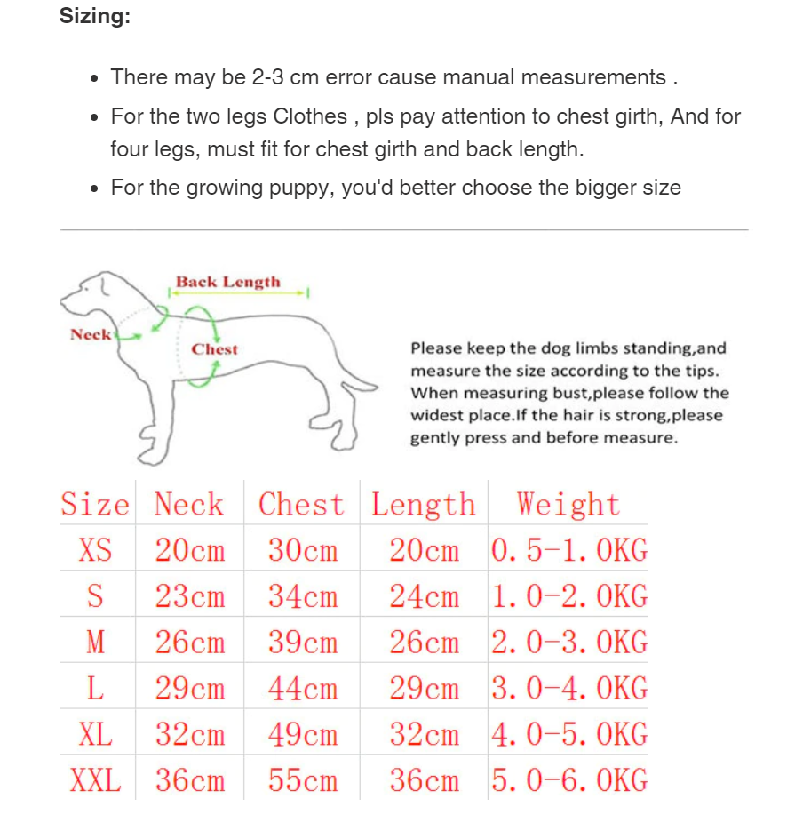 - For the two legs Clothes , pls pay attention to chest girth, And for four legs, must fit for chest girth and back length.