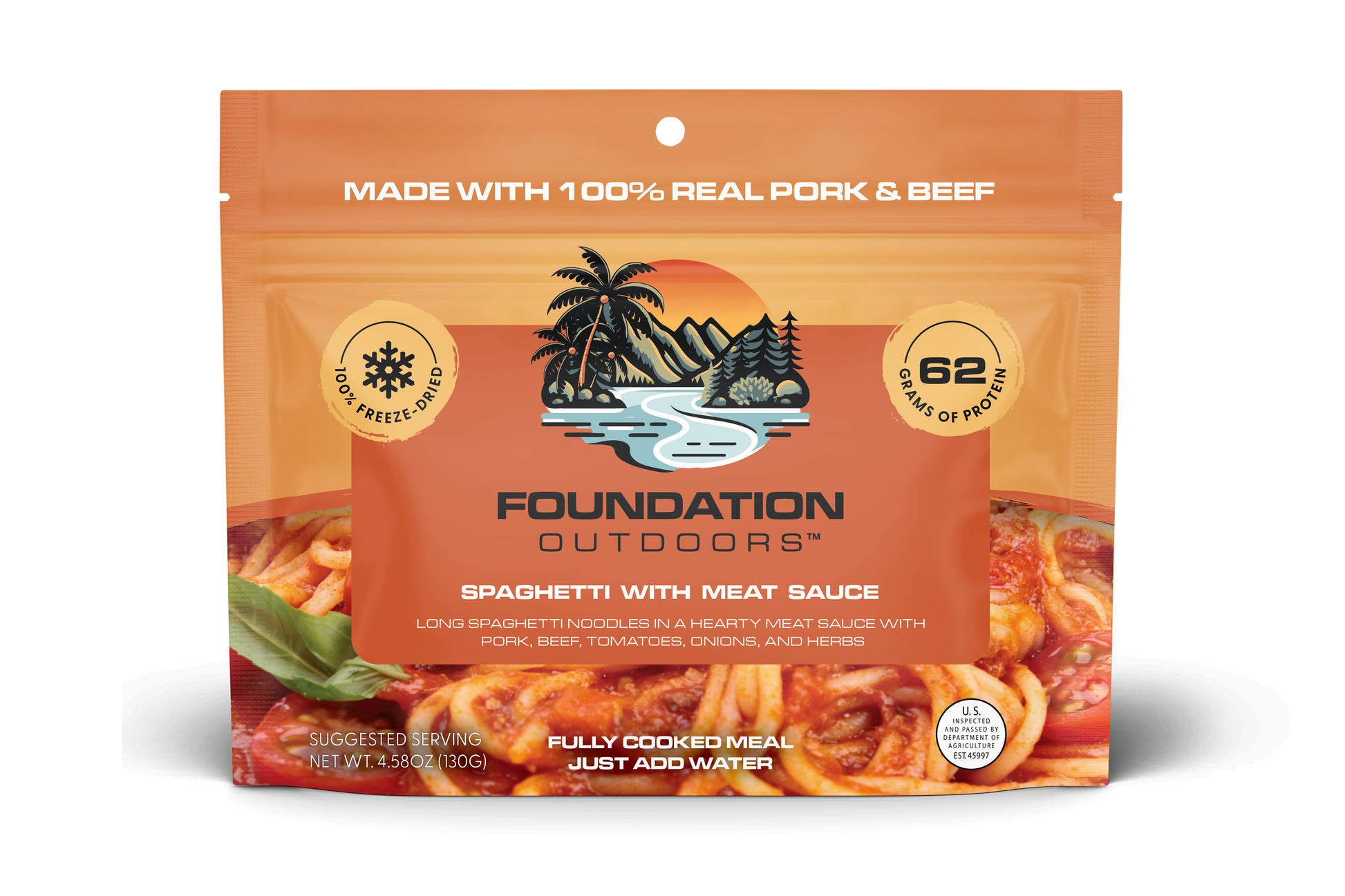 FOUNDATION Outdoors Spaghetti with Meat Sauce Freeze Dried Meal is a classic and comforting Italian dish that combines tender strands of spaghetti pasta with a rich, flavorful seasoned beef and Italian sausage tomato sauce. Our meat sauce is made the traditional Italian way using both beef and pork sausage. This entree includes a hearty tomato base with zesty spices and blended with onions, garlic, carrots, beef broth, and peppers. Actual red wine is added to accentuate the balance of flavors and maximize the complex notes of our authentic Italian sauce.