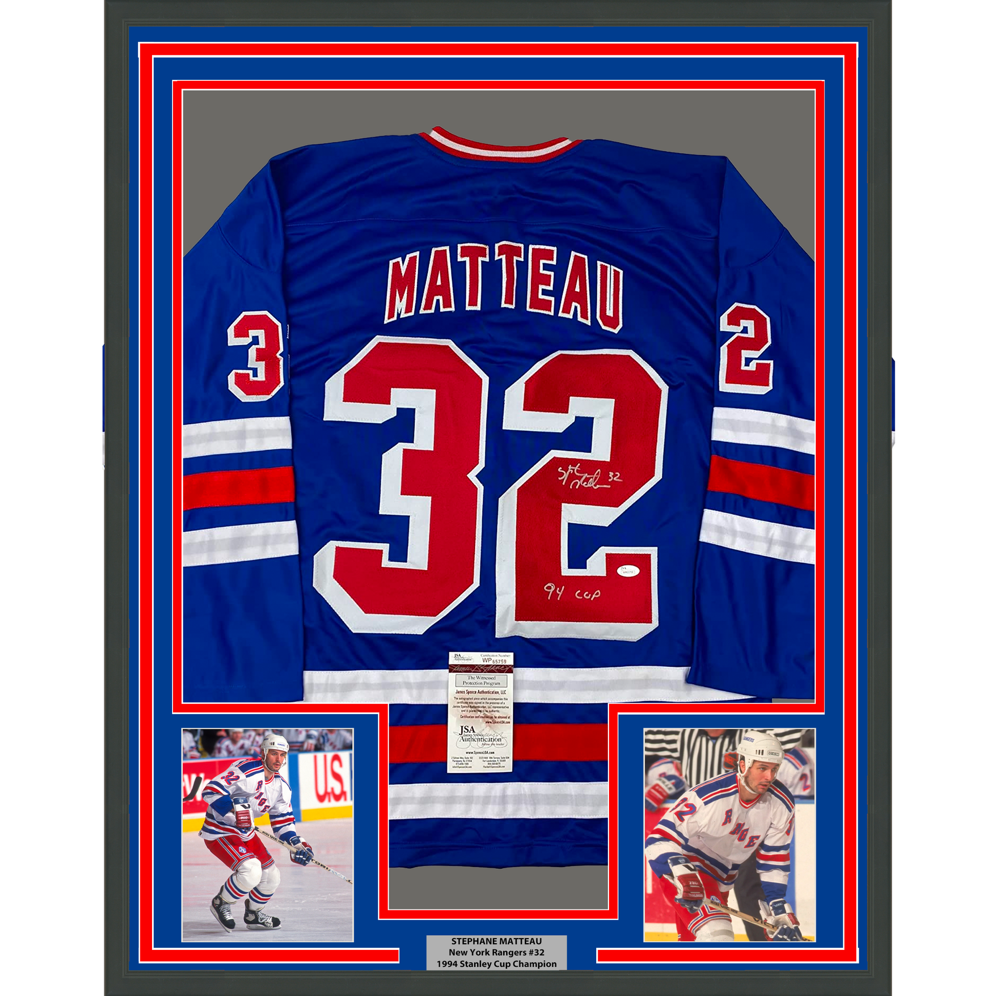 Framed Autographed/Signed Stephane Matteau 35x39 94 Cup New York Blue Hockey Jersey JSA COA