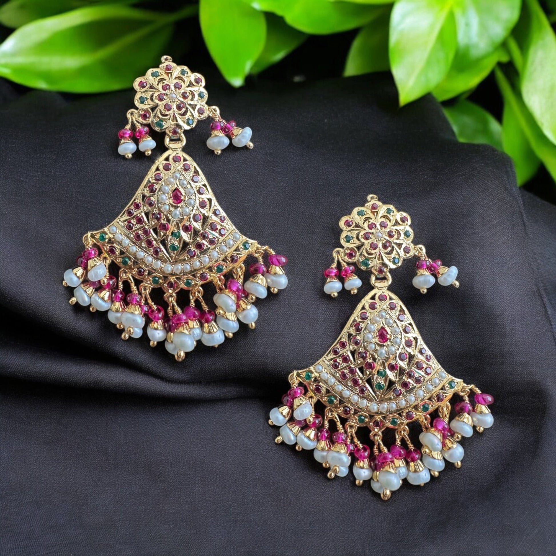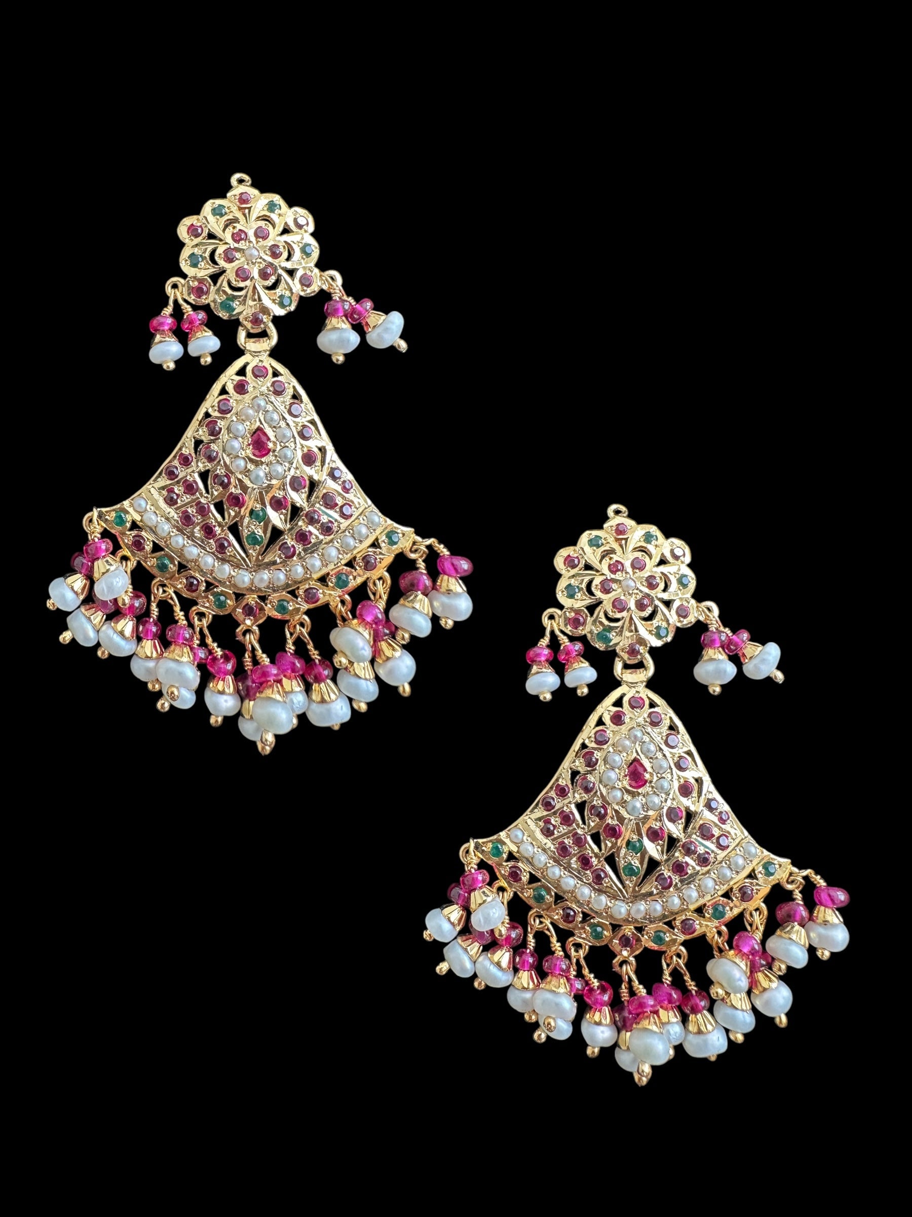 Gold plated silver earrings in ruby and emerlad with pearls ( READY TO SHIP)