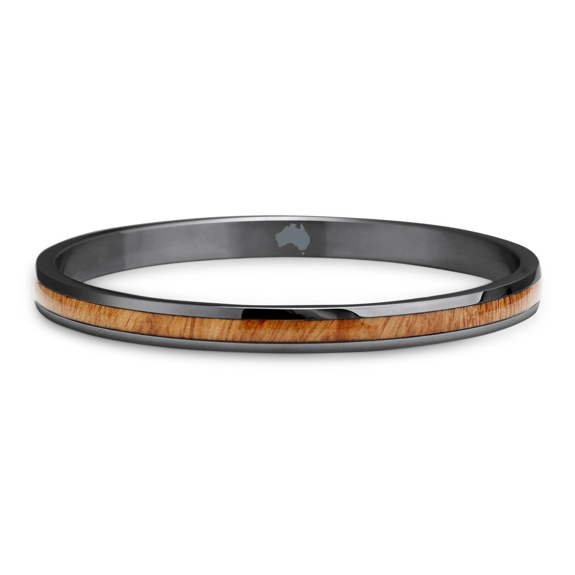 Our Gum Burl (Tasmanian Oak/Stringybark) timber bangle bracelet consists of a surgical grade gunmetal plated stainless steel bangle inlaid with genuine Gum Burl (Tasmanian Oak/Stringybark) timber. Each bangle has Australia engraved inside. Designed for daily wear in any lifestyle, our timber bangles are waterproof, durable and backed by a lifetime wood inlay warranty. Whether an elegant night out in the city or strolling the beach with toes in the sand, the Gum Burl (Tasmanian Oak/Stringybark) timber inlaid bangle bracelet is the perfect accent for any occasion.