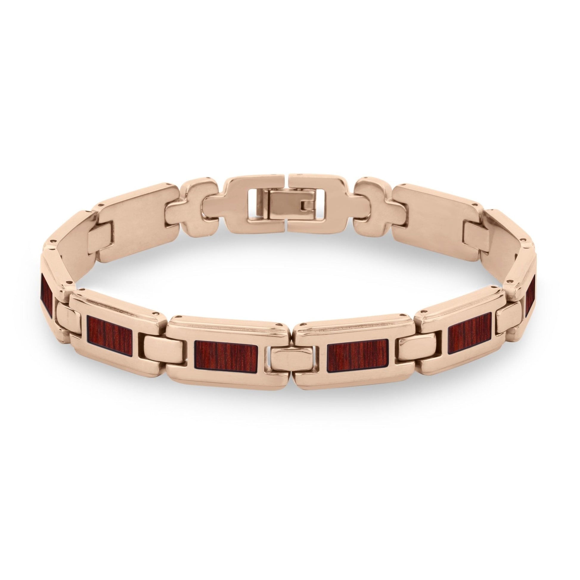 Ladies rose gold plated stainless steel link bracelet with Australian Jarrah wood inlays. Links are removable to adjust for size.