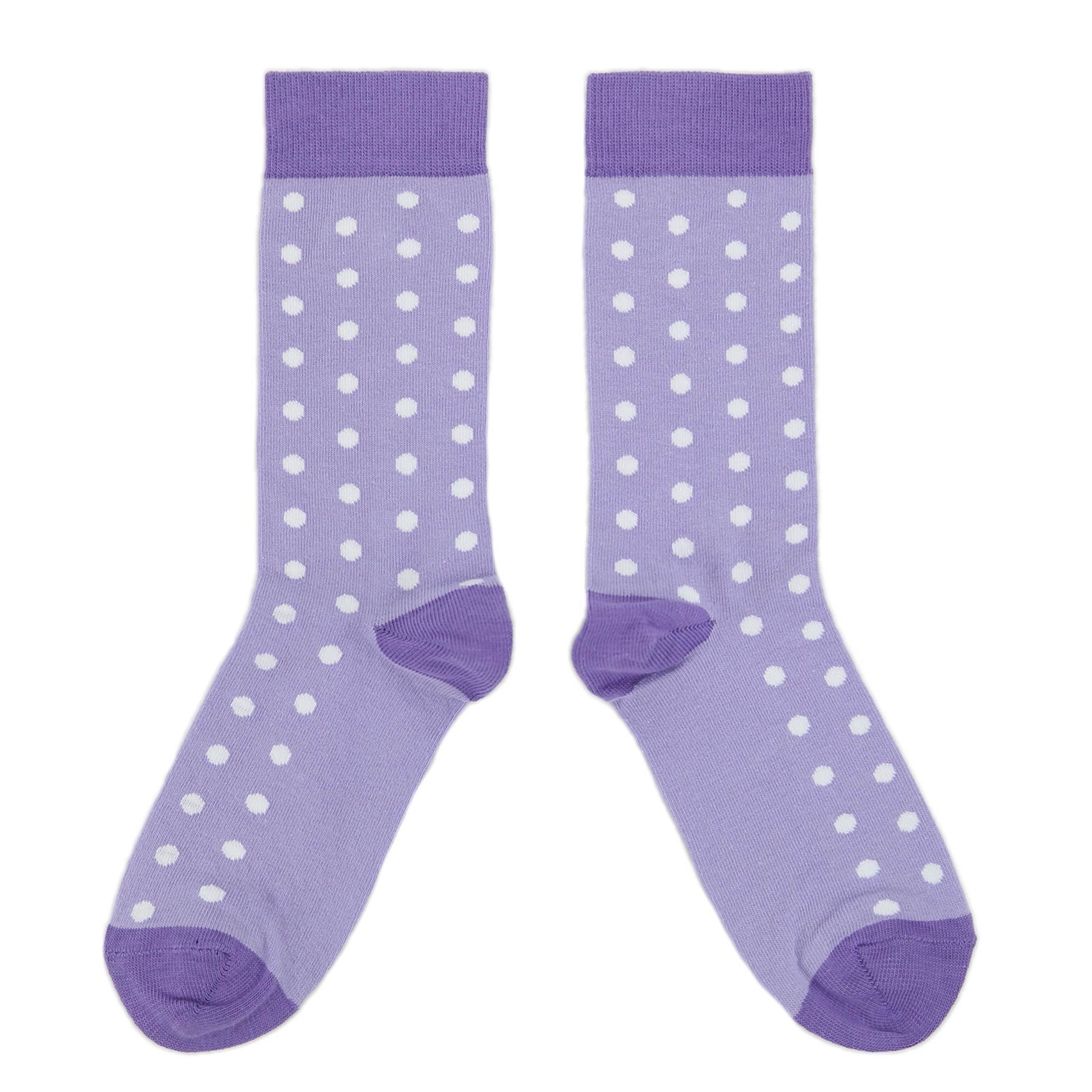Polka dot socks so perfect you'll never want to take them off! These women's socks pair lilac and iris with a sweet, simple pattern of polka dots for a pair of dress socks you can wear anywhere.