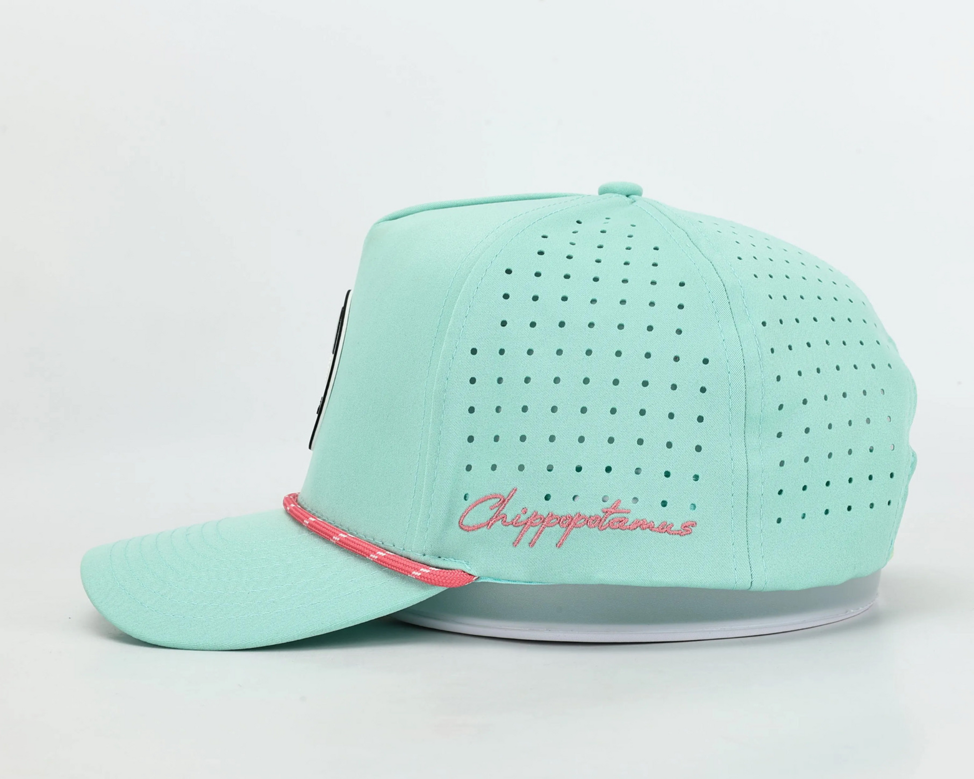 Waterproof material, sweatproof band. 5 panel classic laser cut drilled hole hat in color green with red rope. Rubber made Chippopotamus logo on the front and embroidered Chippopotamus name on the side.