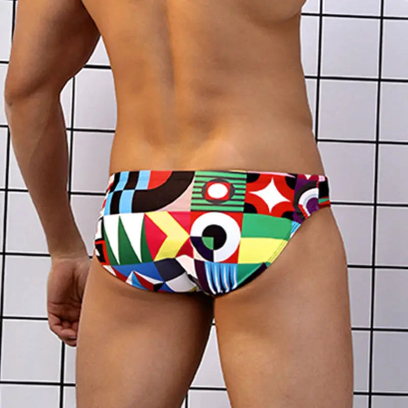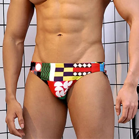 "Get ready to make a statement with these Modernism Swim Briefs! Designed for men who crave adventure and thrive on risk-taking, these briefs feature a striking geometric pattern and a bold low waist design. With a blend of nylon and spandex, they're comfortable, stylish, and perfect for any swim sport. Available in Asian sizes S-XXL, with an elastic waist and internal drawstring for the perfect fit. Don't miss out on the thrilling combination of high cut narrow sides and a hot, sexy look. Live life on the edge with Modernism Swim Briefs - grab yours now!"