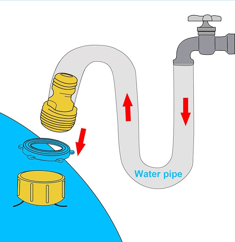 1.Put the gasket on the connector 2.Install the water pipe connector 3.Connect water pipe on the mat 4.Attach water pipe to the faucet and fill the water