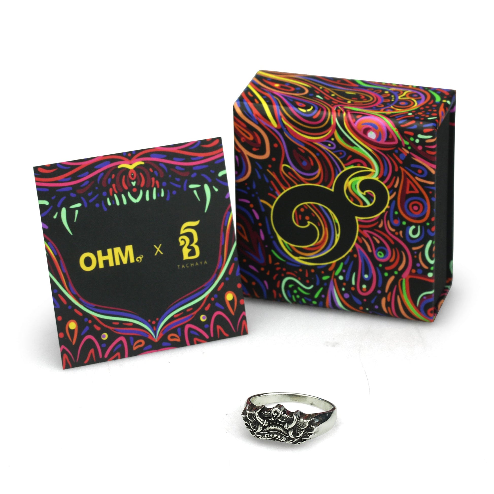 The work in the OHM X Tachaya collection is the perfect balance between uniquely different designs in the "Be You Be OHM" ethos and focus on the sacred things Keng Tachaya worships. There are 3 silver designs, namely Yaksha, Ganesha, and Naga. And 3 glass, namely Intimate, Triumphant, and Opulent, plus a new ring concept, The Ring Of Protection!