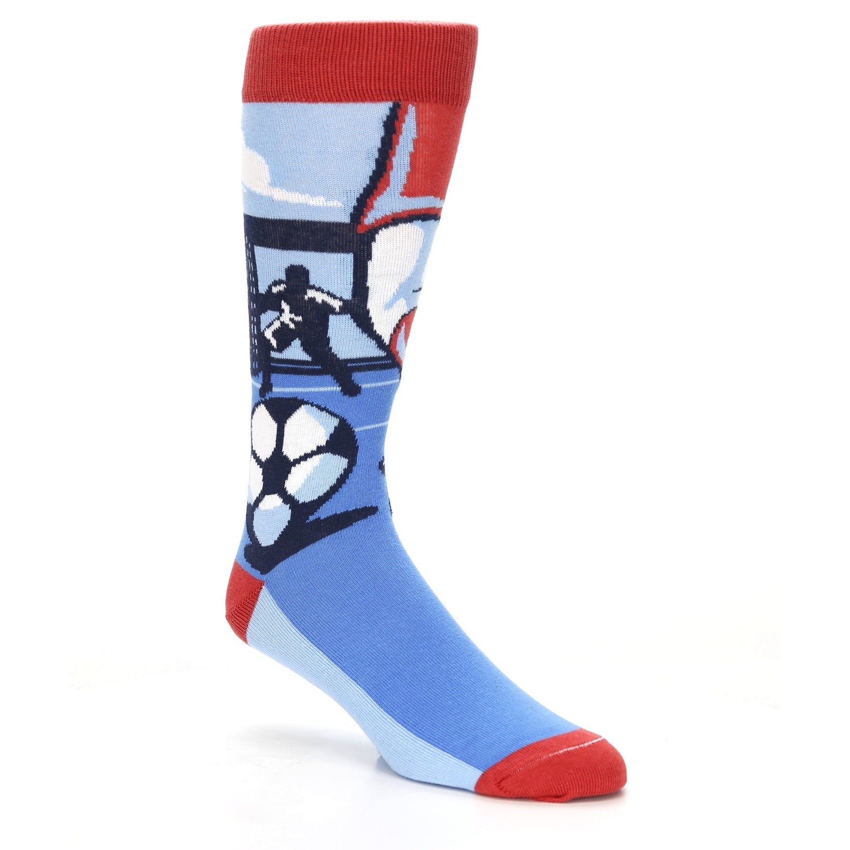 The most popular sport around the world (though not here in the USA, yet), soccer, or futbol, is one-of-a-kind team finesse sport. Celebrate those that celebrate the pitch with soccer goalie socks. These fun men's socks feature a caricature of a male goalie in the middle of a day game. These soccer socks are one-of-a-kind. No red cards here.