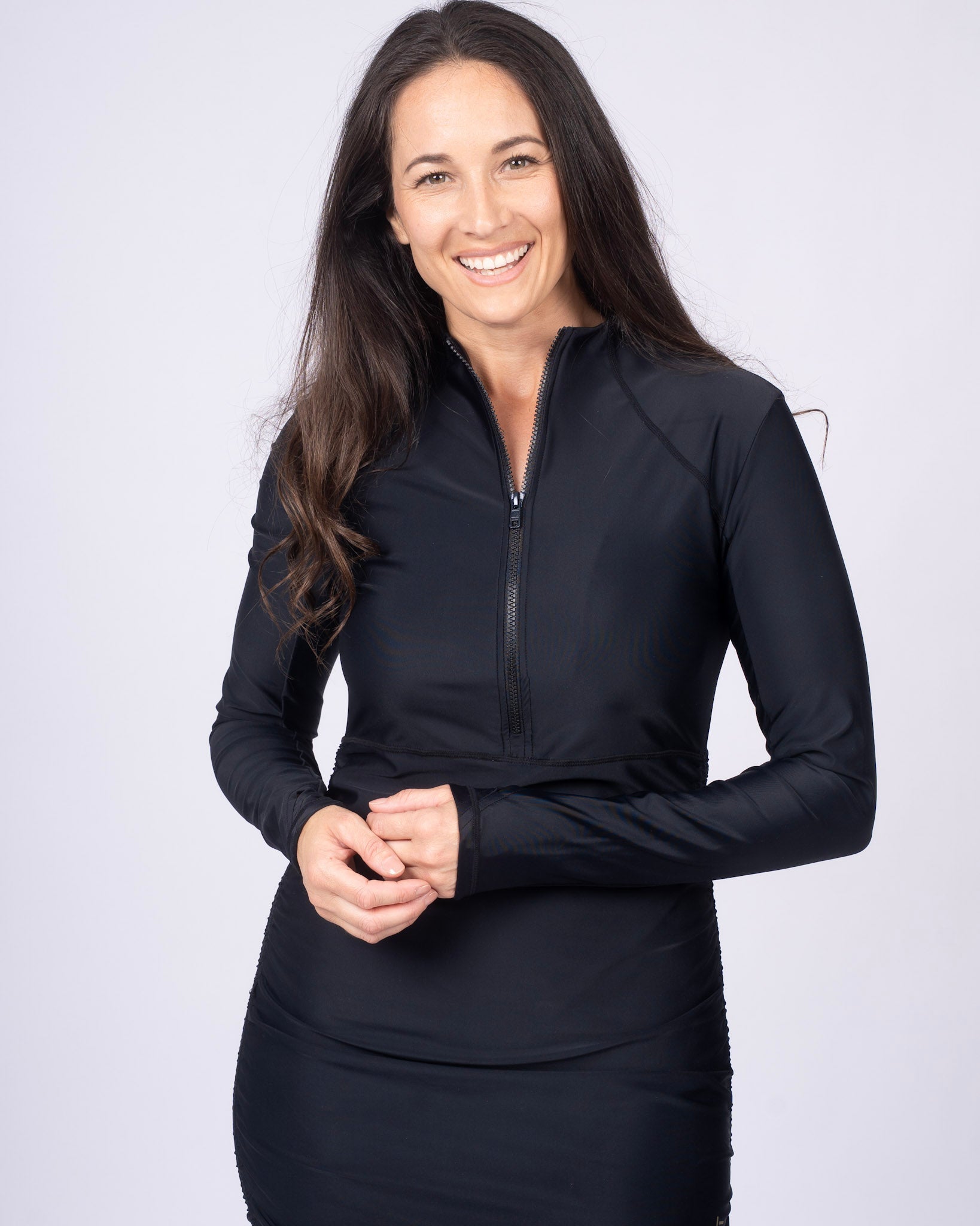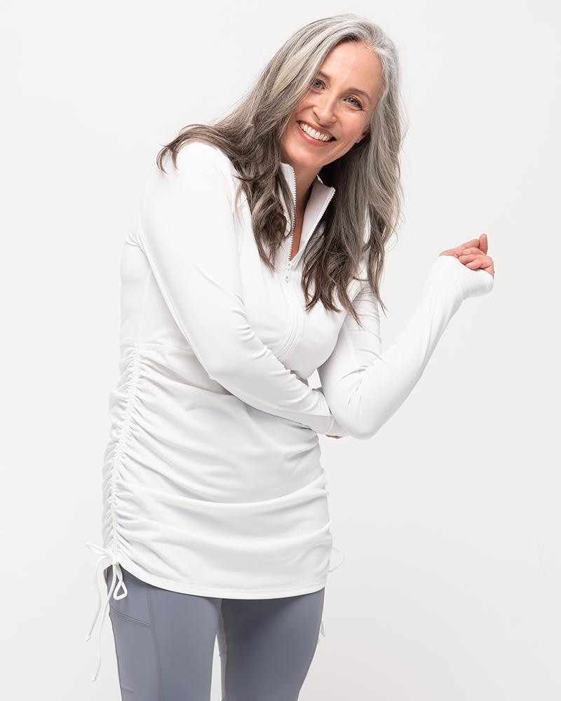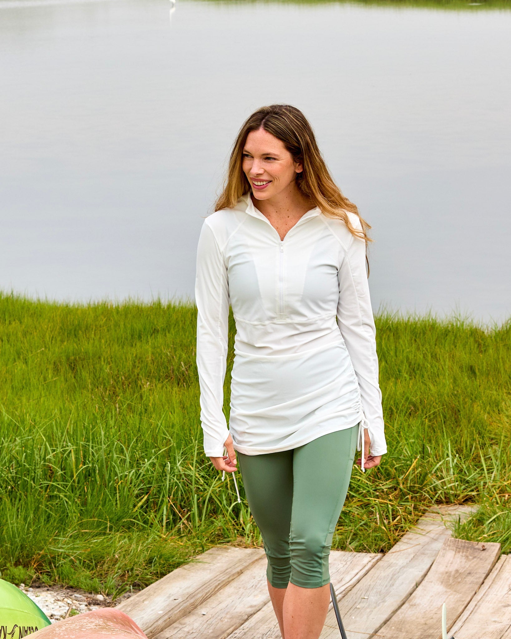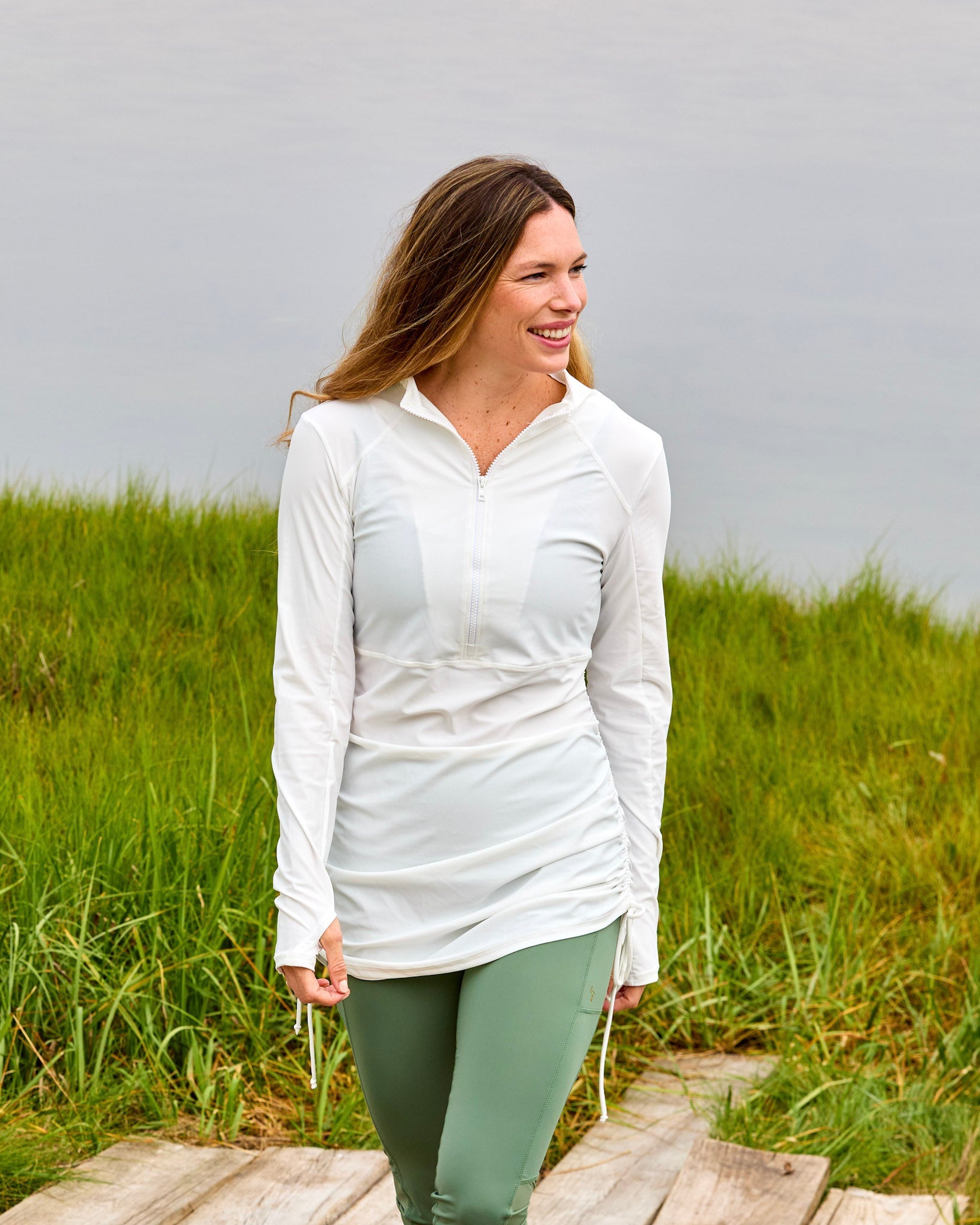 Versatility looks flattering from morning dip to sunset cruise and every activity in between. Cinch up the side ties to wear as a tunic. Let out the drawstrings for a longer length. Wear over our swim leggings for extra coverage. Your choices run deep with this layer.