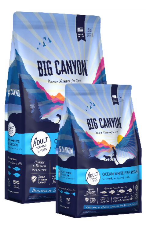 Big Canyon Ocean White Fish dog food delivers big nutrition in every bite. Thoughtfully developed for dogs of all sizes with protein-rich ocean white fish as the first ingredient, it provides a complete and balanced diet for long-term health while providing energy for all-day play. From lakeside strolls to dog park play, fuel life-long adventure with Big Canyon.