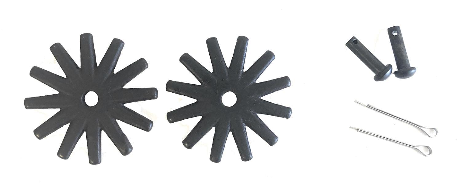 This package include one pair of black steel spur rowels, two spur pins and two cotter pins