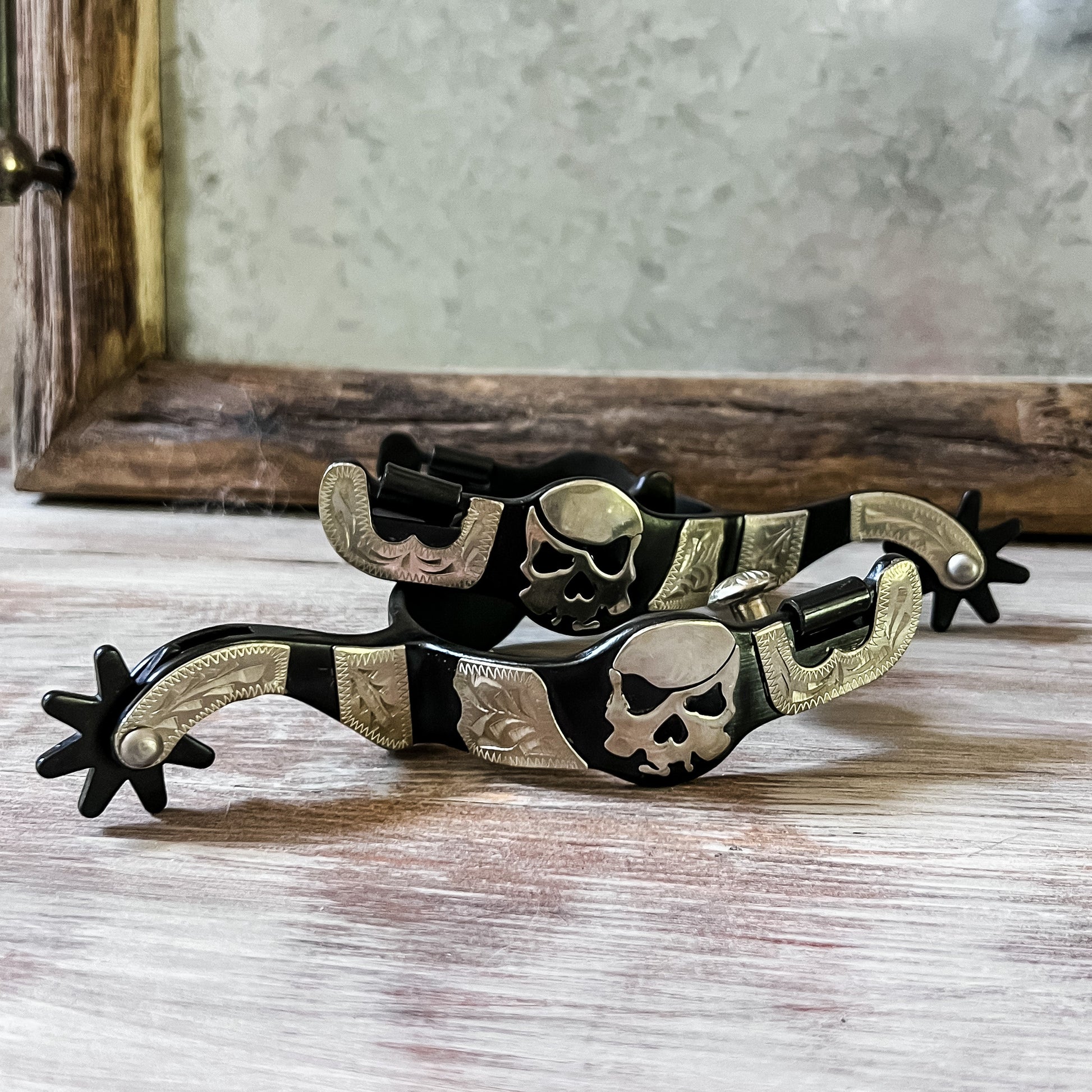 The AJ Tack Men's Antique Brown Pirate Skull Spurs bring a bold, rebellious style to your western gear collection. Crafted from black steel with a 3⁄4" scalloped band, these spurs feature a distinctive pirate skull motif, complemented by a hand-engraved silver overlay. Perfect for the rider who enjoys a unique, rugged look, these spurs provide the perfect balance of style and function.