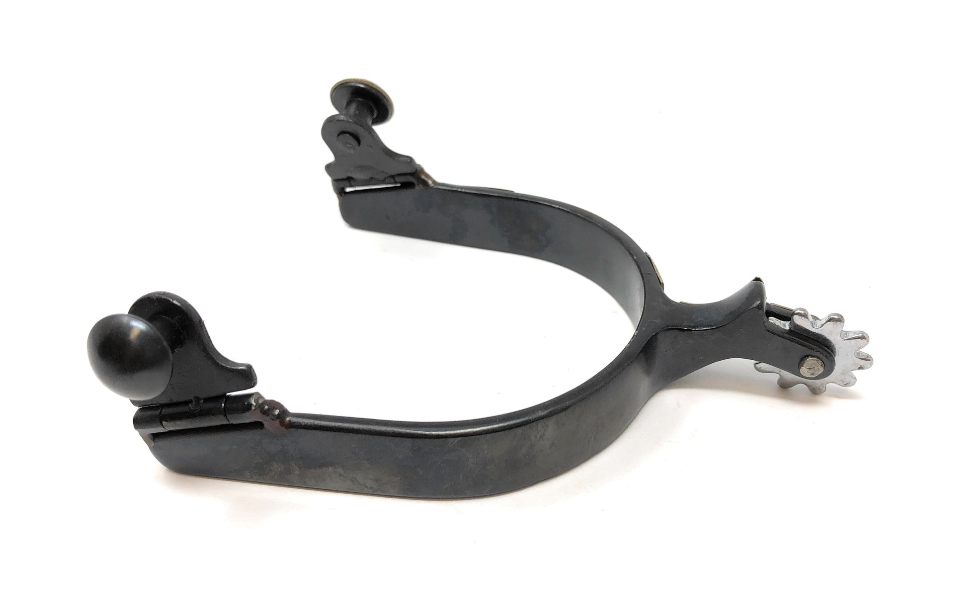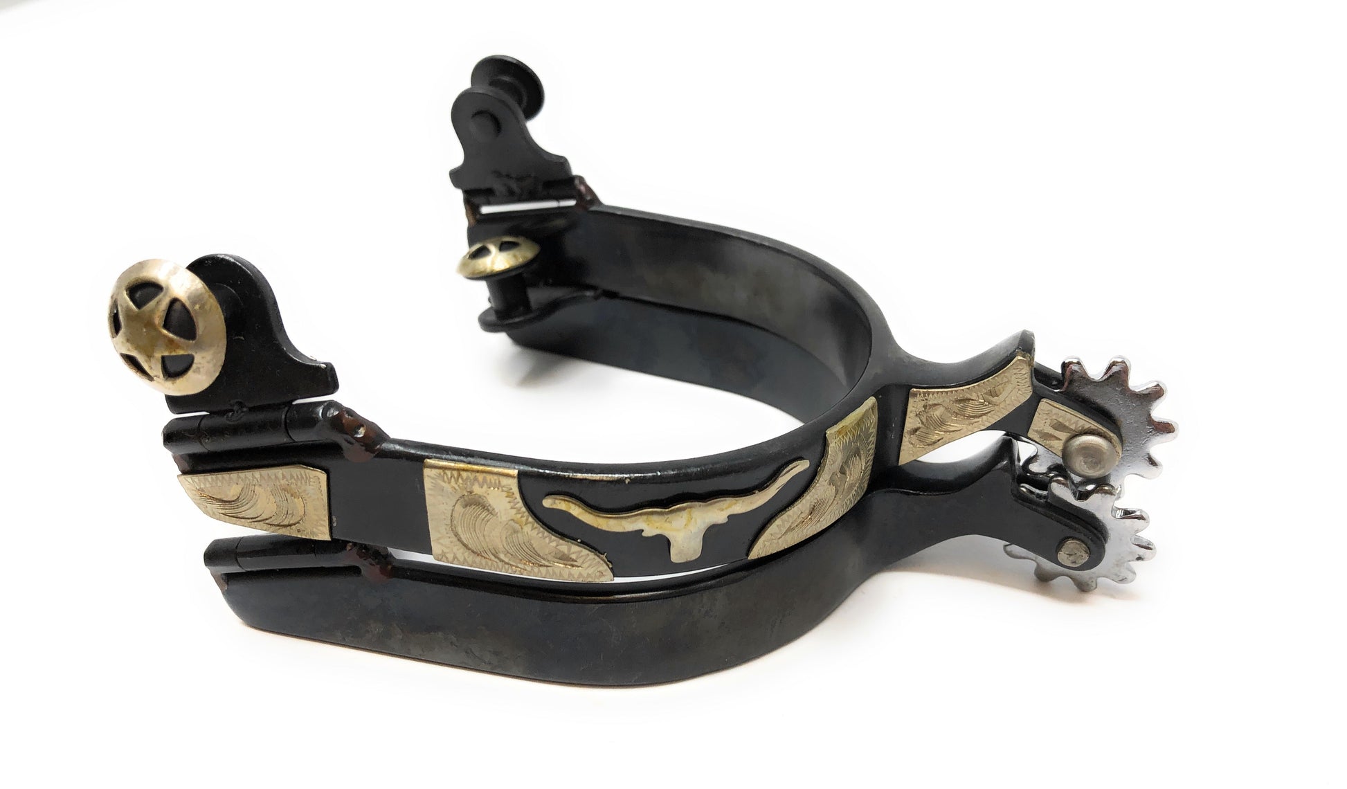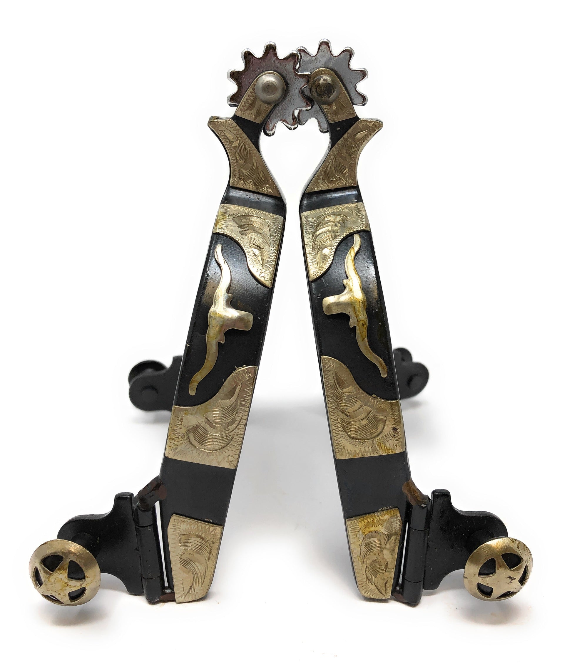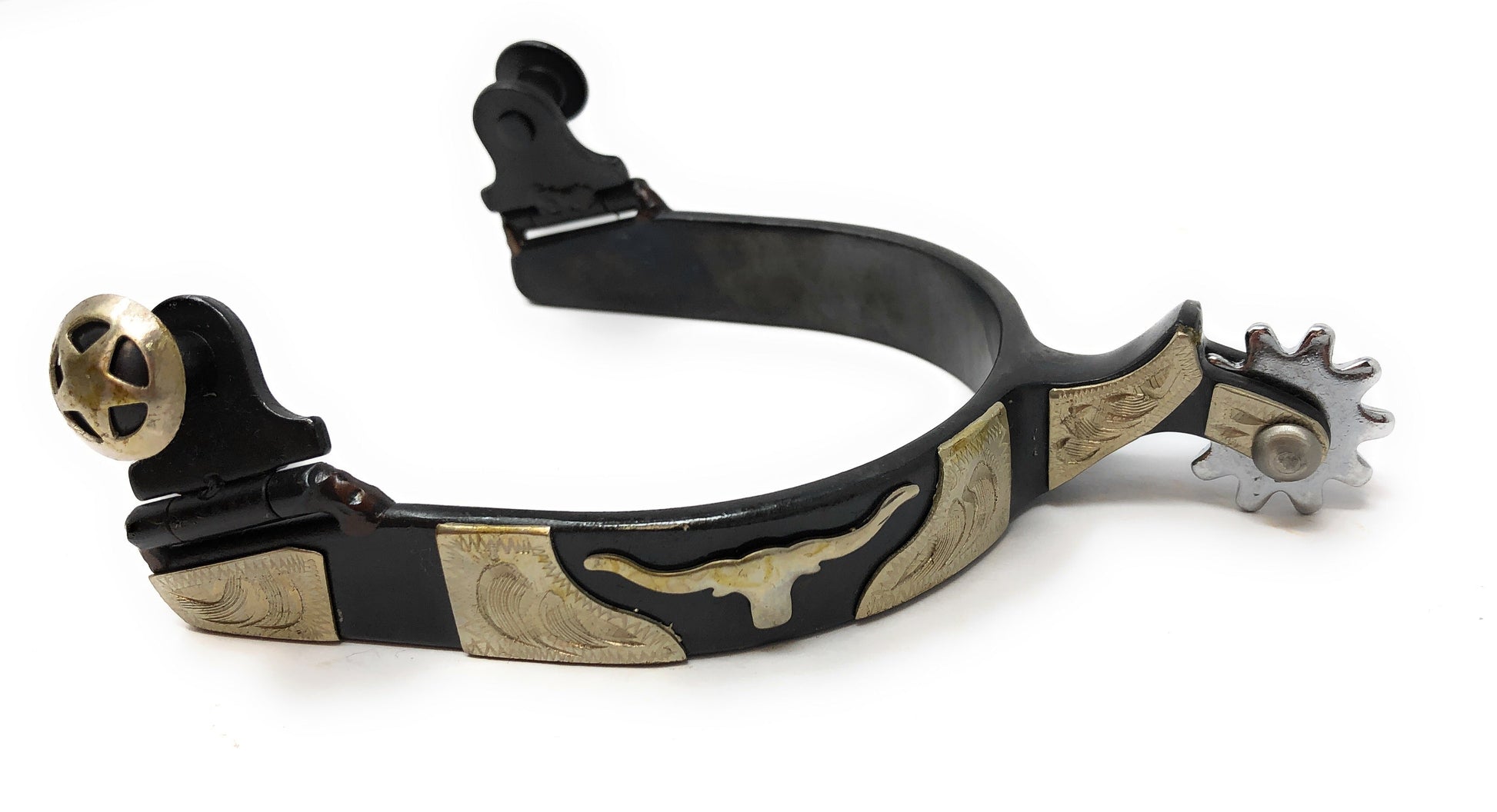 The AJ Tack Men's Longhorn Show Spurs are crafted from black steel and feature a beautifully hand-engraved silver steer head overlay, complemented by a silver star button for added detail. These spurs are designed to provide both style and functionality, making them perfect for western shows or daily wear. The 3" opening and 3 1⁄4" depth provide a comfortable fit, while the durable materials ensure long-lasting performance. Whether you're in the ring or out on the trail, these spurs are sure to impress.