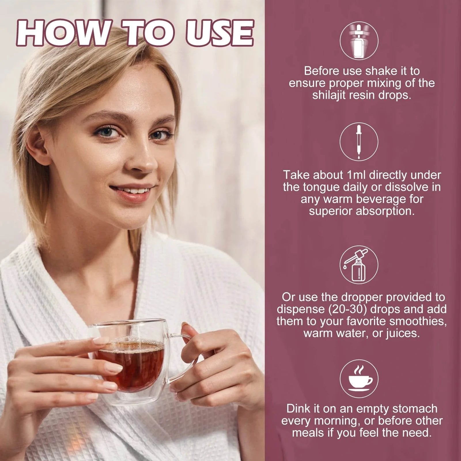 ✅【EASY TO TAKE LIQUID FORM SHILAJIT】- This pure Shilajit in liquid form is enriched with vital minerals and is more easily absorbed than capsules, pills and powders. Compared to shilajit resin, shilajit liquid drops are easier to take. You may take 2ml directly into mouth or add them in water or your favorite beverage.