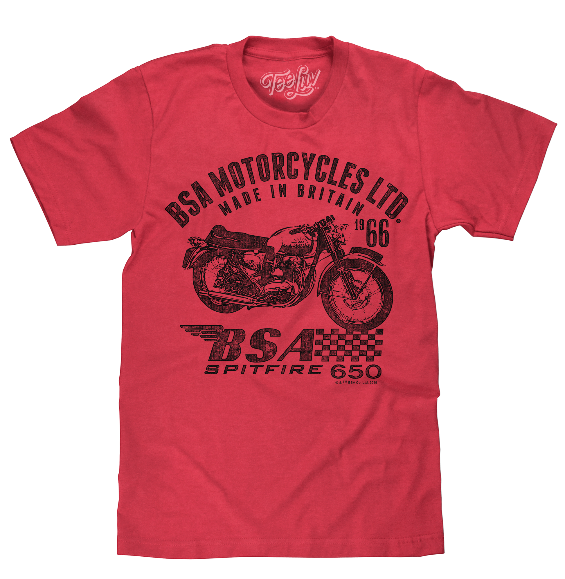 Our team decided that it was time to pay tribute to this British classic - so we've featured a graphic of the BSA Spitfire 650 Mark II, along with the "BSA Motorcycles Ltd" and "Made in Britain" text. To complete the retro look and feel on this tough Spitfire shirt - we’ve distressed the entire graphic and printed it on the softest and highest quality, poly-cotton red heather tee around.