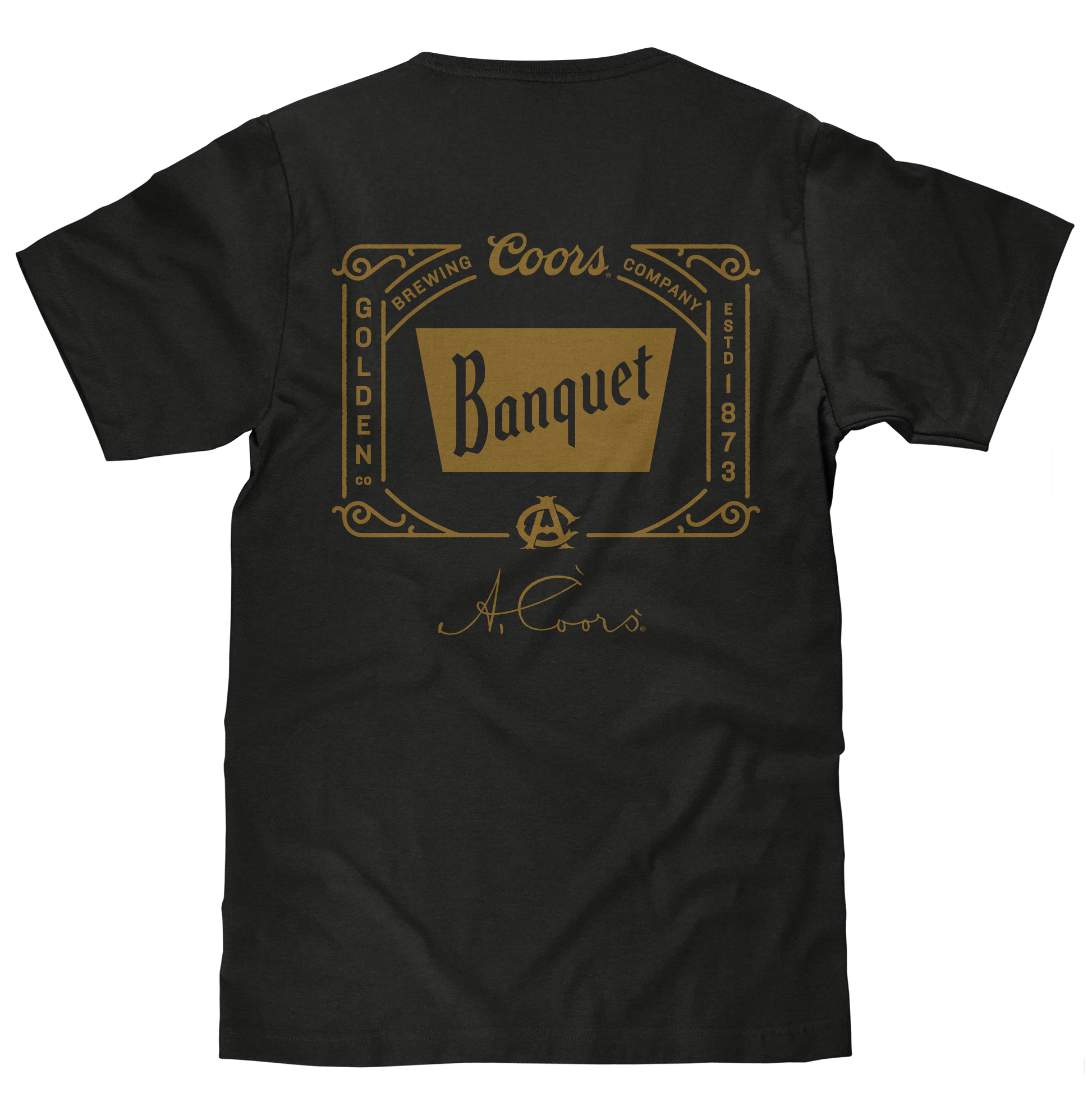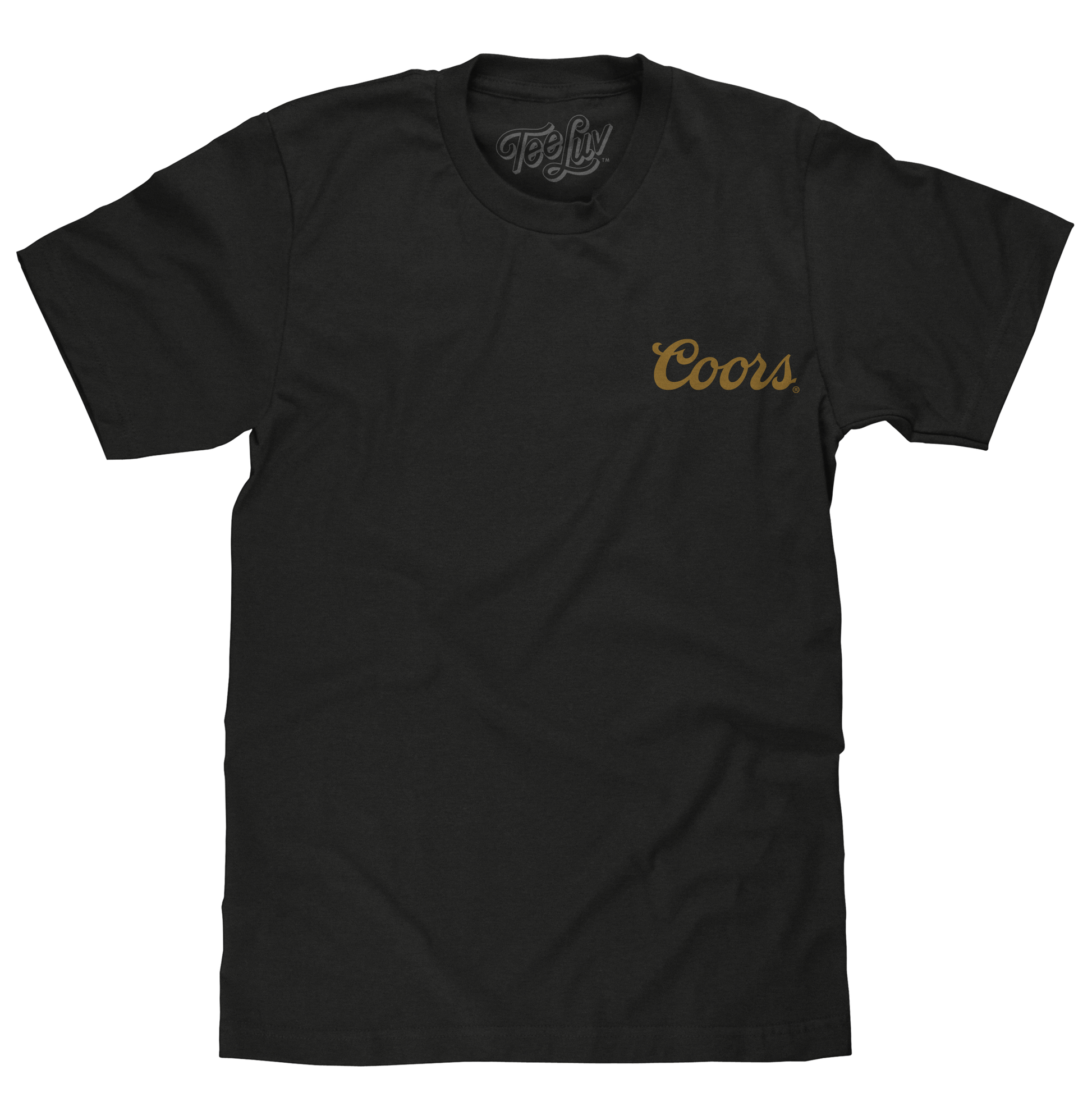Founded in 1873 by Adolph Coors in the mining town of Golden, Colorado, the Coors Brewery has spent over a century perfecting the Banquet beer beloved around the world. Inspired by these beer pioneers and their dedication to tradition, the Tee Luv team created this double-sided graphic tee featuring the classic Coors script logo on the left chest. On the back, we added vintage artwork from the early days of the brewery - including the Coors Brewing Company Banquet logo, "Golden Co" and "Estd 1873" text, and the founder's signature. To complete the timeless look of this Coors Banquet shirt - we've printed the design in matte gold on a soft, Vintage Black cotton tee.