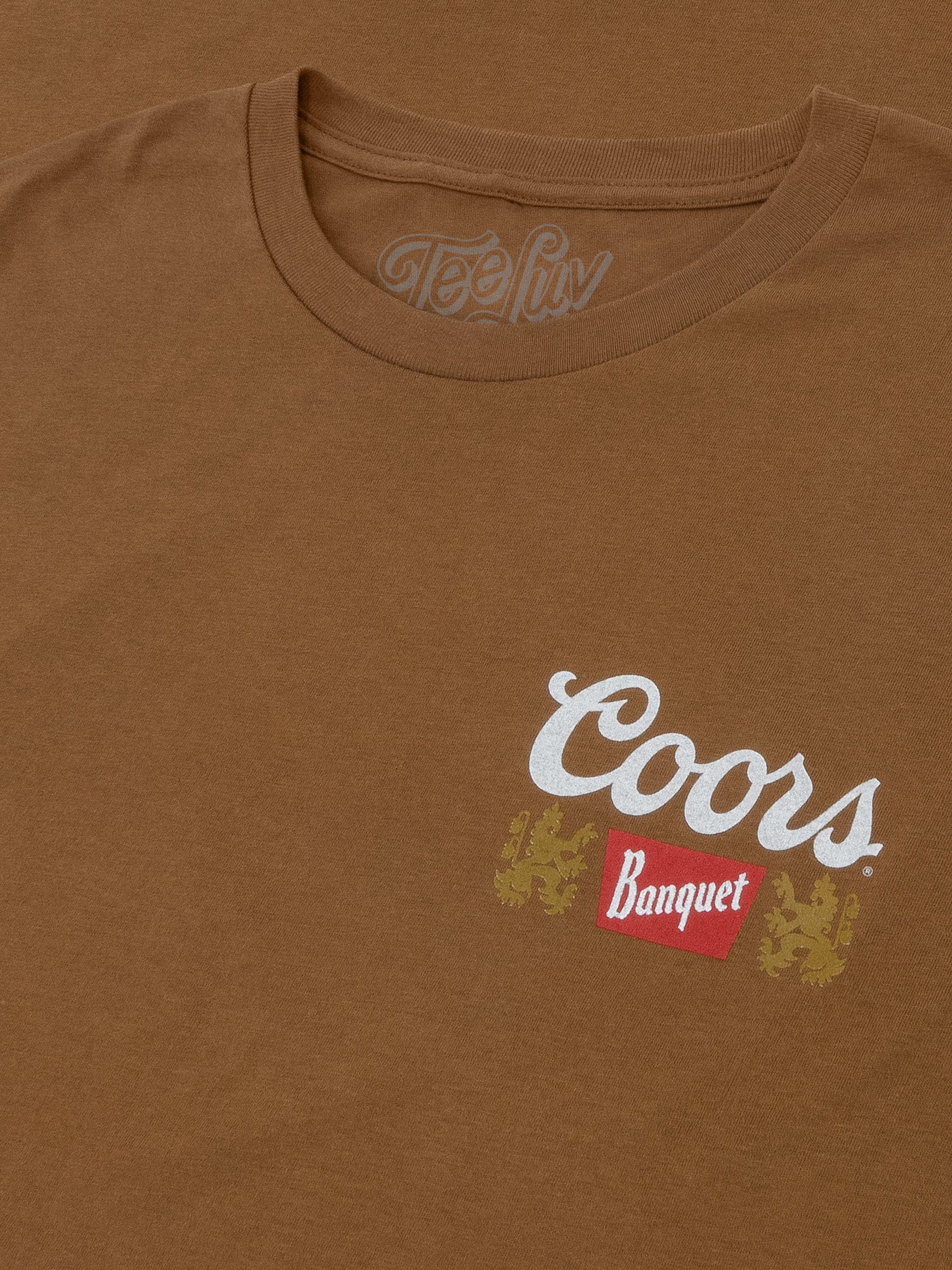 We decided to pay tribute to the refreshing taste of Coors Banquet, and its humble history with a double sided graphic t-shirt featuring the instantly recognizable Coors Banquet logo on the left chest, and a full sized waterfall graphic featuring "Golden, Colorado" and "Brewed with 100% Rocky Mountain Water Since 1873" text on the back.